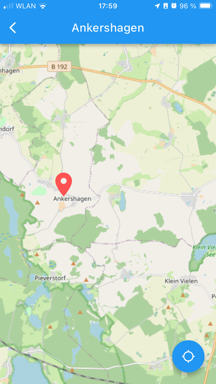 Durch die Aktivierung des Pins (rechts oben) wird automatisch das nächstgelegene Bauwerk zum aktuellen Standort ausgewählt.