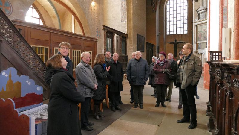 Gerd Meyerhoff, Baubeauftragter der Nordkirche für Pommern, stellte danach „Vorreformatorische Kunst in Stralsunder Kirchen“ vor, die anschließend exemplarisch in der Nikolaikirche unter Führung von Dr. Sabine-Maria Weitzel (Autorin einer grundlegenden kunsthistorischen Monographie über die Stralsunder Nikolaikirche) besichtigt wurde. Sie hob immer wieder hervor, wie stark in der vorreformatorischen Zeit die Kirche ein Ort war, in dem gottesdienstliches Leben eng verbunden war mit dem Alltagsleben der hansestädtischen Bürgergesellschaft. Gerade diese Verbindung hat dazu beigetragen, dass bereits vor der Reformation eine Veränderung in der Praxis der Messfeiern einsetzte, die immer weniger als „opus operatum“ vom Priester vollzogen wurden, als „singende Messe“ immer mehr als Gottesdienst einer dazu versammelten Gemeinde.