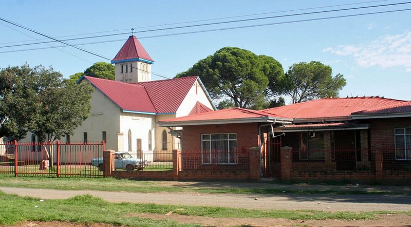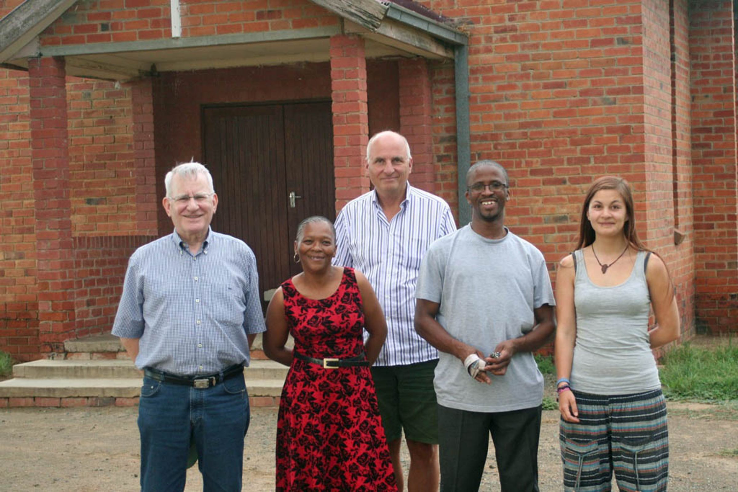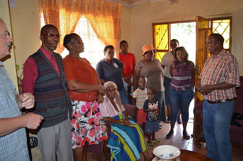 Dann geht es auf zur Kirche in der Gemeinde Thabong, die 1958 vom deutschen Superintendenten E. Müller erbaut wurde. Die Kirchenälteste Martha Mngoboli, Schatzmeisterin der Gemeinde, führt uns und berichtet, dass die Gemeinde aus etwa 120 Personen besteht, von denen etwa die Hälfte jüngeren Alters sind. Sonntags besuchen etwa 60 Gemeindemitglieder den Gottesdienst. Von solchen Quoten können wir nur träumen! In Marthas Haus treffen wir ihren Mann Isaac, der jüngst einen Schlaganfall erlitt. Wir singen für ihn einen Kanon und sprechen ein gemeinsames Gebet.