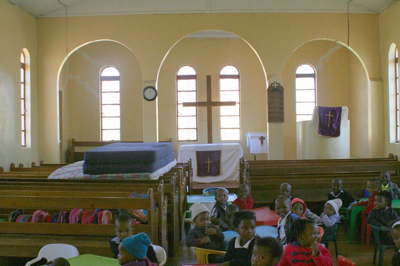 Es ist der letzte Tag. In meinem Auto sitzen Dean Nzuza und Pastorin Biyela – also 100% der hauptamtlichen Pastorenschaft des Eastern Cape. In Biyelas Pfarrhaus in Zwelitsha wird es Mittagessen geben. Während drei ihrer insgesamt 11 Gemeindeglieder (Zwelithsa ist die kleinste Gemeinde in Ihrem Pfarrstellenbereich) für uns kochen, schauen wir uns die Kirche an. Drin gibt es großes Geschrei, jedes Mal wenn ich auf den Auslöser des Fotoapparates drücke. Der Blitz fasziniert und erschreckt 30 Kinder zugleich. Die Kirchengemeinde hat die Kirche in der Woche an einen privaten Kindergarten vermietet, dafür gibt es 1.000 Rand pro Monat (rund 80 €) Miete.
