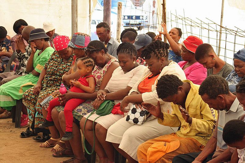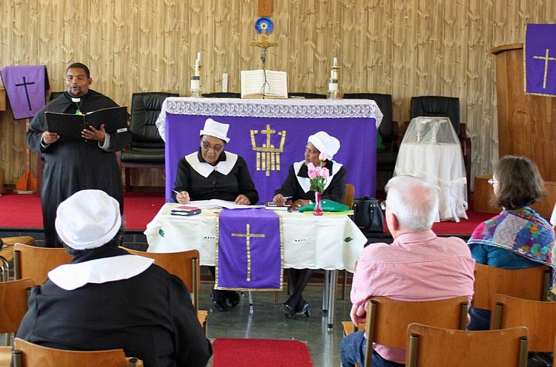 Gegen 9:00 Uhr starteten wir mit zwei Wagen in Richtung Norden ins 70 km entfernte Warrenton. Auf einer sehr gut ausgebauten Fernstraße – wieder vorbei an dem großen Flamingosee, den wir gestern leider nicht besuchen konnten – erreichten wir den Vorort Warrenvale, um an einer Mini-Konferensie der Gebedbondsusters der Evangelies-Lutherse Kerk St. Phillip teilzunehmen. Wir wurden von den ‚Gebetsbundschwestern‘ sehr herzlich empfangen und feierten gemeinsam das Abendmahl. Die Gebetsbundschwestern tragen einen schmucken Dress, der allerdings bis auf die Länge der Rockfalte (10 cm), der Breite des weißen Kragens (12 cm) und der Hutkrempe des Häubchens festgelegt ist. Da die Mini-Konferenz der etwa 20 Frauen zur Vorbereitung einer großen Jahreskonferenz der Gebedbondsusters in Kimberly diente, wurde der Dresscode noch einmal vom jungen Pastor Charlton Broestein in allen Details vorgelesen, da bei Verstößen empfindliche Geldstrafen drohen. Die überwiegend älteren Damen muteten an, als seien sie just aus einem Bild von Breughel gestiegen. Der Empfang war herzlich, wenngleich wir mitten in die Tagungsordnung platzten: TOP 2. Kleed (s.o). Dann begann ein für uns sehr überraschender Teil, die Finanzierung der Konferenzteilnahme Ende März und einer Abtrennung des Altars vom Gemeinderaum durch einen Vorhang.