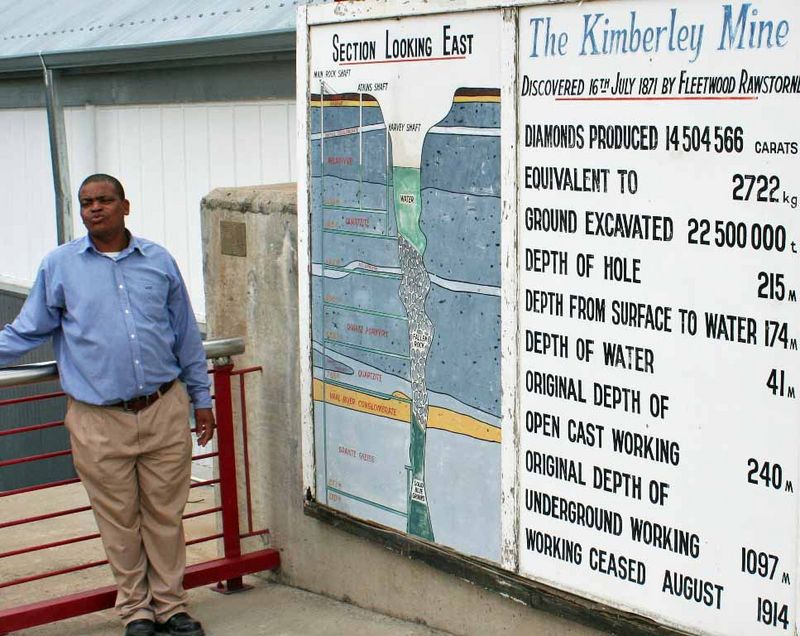 Am Nachmittag besichtigen wir das große Loch von Kimberley. Über zweihundert Meter tief haben sich Menschen hier in die Erde gegraben, um Diamanten zu finden. Die ganze Stadt ist in jener Zeit aus dem Boden gestampft worden. Das alles, weil im Jahr 1866 ein kleiner Junge namens Erasmus Jacobs beim Spielen einen Diamanten findet. - Nebenbei telefoniere ich mit Charlton Broekstein, dem Pastor von Warrenton. Ob wir morgen seine Gemeinde besuchen können? In der Gemeinde, die auf dem Plan stand für uns, gibt es eine große Beerdigung. Das geplante Gespräch mit dem Kirchenrat muss deshalb leider auf Sonntag verschoben werden. Kein Mensch hätte Zeit für uns. Charlton freut sich auf uns und sagt zu.