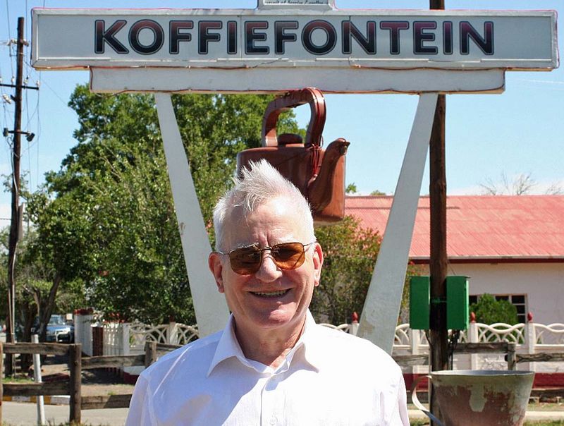 Stark und selbstbewusst stehen die Kinder da. Ihr Anblick rührt das Herz an. Und ihre Botschaft sowieso. - Früher gehörte der Kindergarten übrigens der Lutherischen Kirche, jetzt wird er vom Staat betrieben. Gleich daneben starten wir auch der Schule einen kurzen Besuch ab. Kurz nach 10 Uhr fahren wir ab. Heute wollen wir pünktlich sein. Pastorin Kathleen Prinsloo hat als einzige schon vorher uns per Mail einen langen Plan geschickt, was in ihrer Gemeinde geschehen wird, wenn wir da sind. Unterwegs fahren wir wieder durch Koffeefontein und halten an der Kaffeekanne an.