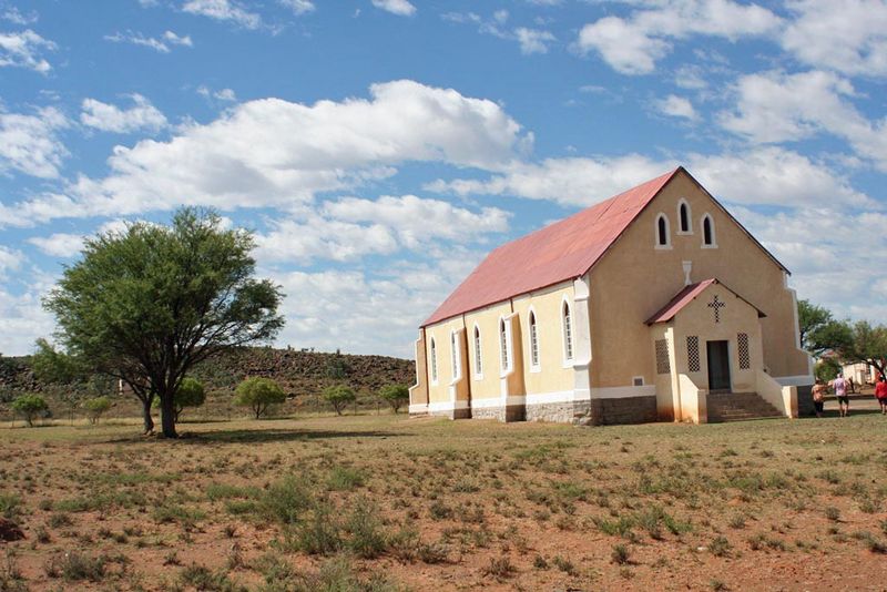 Nach der Besichtigung des Nationalparks fuhren wir weiter nach Soutpan, um dort die kirchliche Situation vor Ort wahrzunehmen. Soutpan ist eine von drei Außenstationen der Pfarrstelle Bloemfontein Nord, die weiteste Außenstation ist übrigens rund 100 km entfernt. - Wir fanden dort eine kleine Kirche vor, welche am 12.11.1977 eingeweiht worden ist. Diese Kirche war ausgesprochen sauber und wird dauerhaft für wöchentliche Gottesdienste genutzt, nur alle zwei Monate kommt der zuständige Pfarrer zum Abendmahlgottesdienst, an allen anderen Sonntagen predigen die Kirchenältesten. Ausgesprochen schön war die Begegnung mit einer Ältesten, die uns sehr herzlich empfing und berichtete, dass sie die Leiterin der Sonntagsschule sei. Jeden Sonntag kommen in diesem kleinen Dorf ca. 10 Jugendliche zwischen 12 und 14 Jahren zu ihr, um sich unterweisen zu lassen. Das sei hoffnungsvoll für diesen Ort, in dem es natürlich wie auch an allen anderen Orten, noch weitere 3 Kirchen gibt.