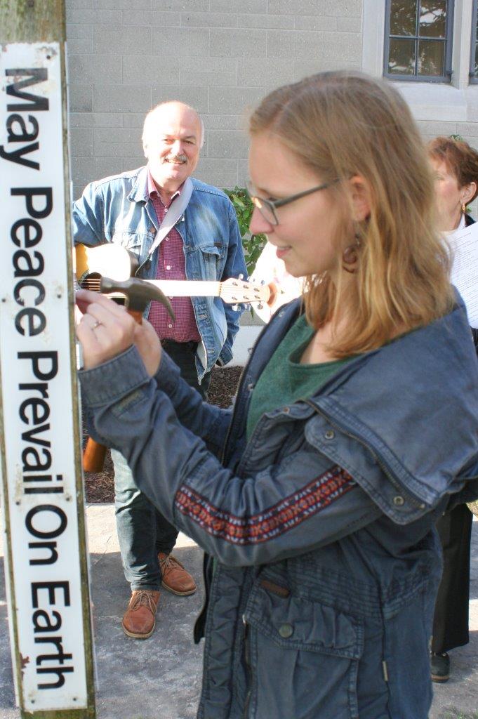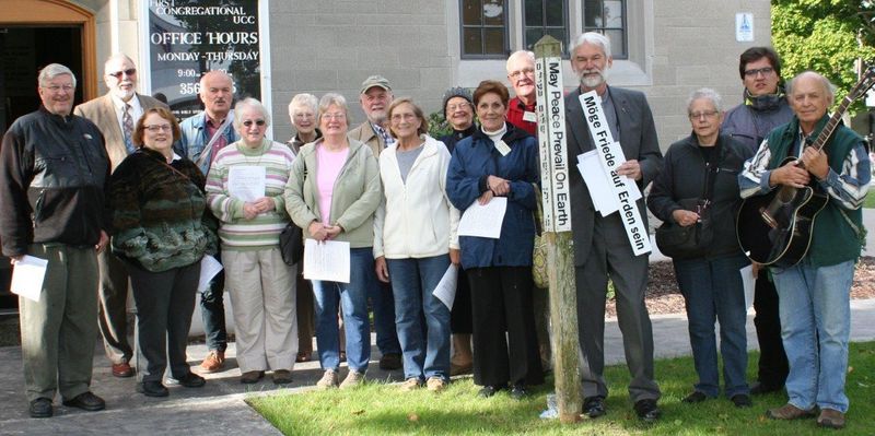 Auf dem Weg zur Kirche bleibe ich plötzlich stehen. Das Bild, das sich mir bietet, ist zu verlockend. One way – Wrong way! Hier richtig. Dort falsch. Die Kirche mitten dazwischen. Wie im wirklichen Leben. Aber wie oft kann man nicht so klar sagen, was der Weg ist! – An der Kirche angekommen, freue ich mich. Da ist ja wirklich Bob Case! Vor 31 Jahren habe ich ihn in Greifswald kennengelernt. Bob gehörte zur Delegation der UCC Michigan zum Bugenhagenjubiläum. Wir fuhren zusammen in den Wald, um Grünes für die Blumensträuße der Christuskirche zu holen. Bob staunte, was alles in so einen kleinen Trabant passt. Damals kam er als frischgebackener Pastor von Alpena – und jetzt ist er schon im Ruhestand. Wir treffen uns mit Anglikanern, Lutheranerinnen, einer Katholikin und etlichen UCC-Leuten am Friedenspfahl vor der First Congregational Church. Dort steht schon spanisch, vietnamesisch und englisch, was heute nun auch deutsch am Pfahl angebracht werden soll: Möge Friede auf Erden sein. Als der Pfahl vor Jahrzehnten errichtet wurde während des Vietnamkrieges, sorgte das für viel Gesprächsstoff. Wir singen und beten: „Lass Frieden auf Erden sein. Lass ihn mit mir beginnen. Lass jetzt diesen Moment sein.“ Dabei nageln Grit und Conrad das deutschsprachige Friedensschild an. Solche Friedenspfähle könnten wir bei uns daheim auch gut gebrauchen, denke ich beim Zusehen. Welche Sprachen würden wir in Pommern auf den Pfahl nehmen?