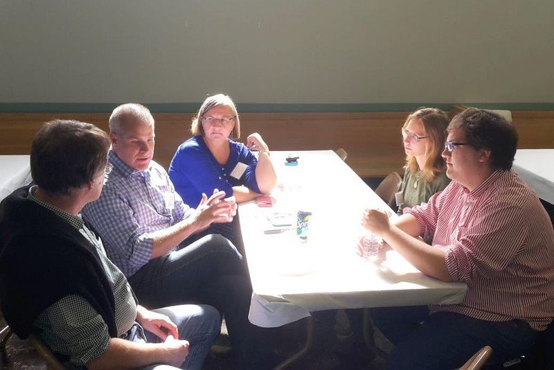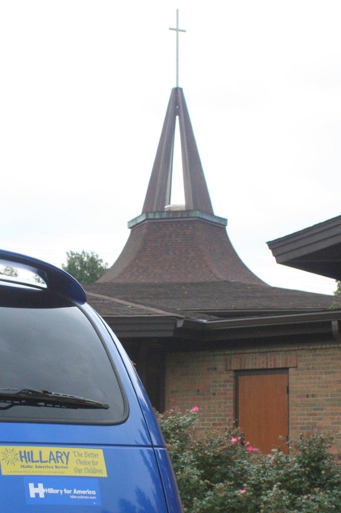 Die Fahrt nach Lansing führt durch den beginnenden Herbst. Farbenfrohe Wälder säumen die Straße, überall werden Kürbisse feilgeboten, manchmal zu richtigen Kunstwerken aufgetürmt. Nach einem kurzen Besuch im Büro der Michigan Conference (also: UCC im Bundesstaat Michigan) in East Lansing, machen wir uns gemeinsam mit Conference Minister Dr. Campbell Lovett auf den Weg zu seiner Gemeinde in East Lansing – der Edgewood United Church. Dort treffen wir die Environment Task Force – eine Gruppe, die sich darum bemüht, eine klimafreundlichere Gemeinde zu werden. In ein paar Wochen soll das Dach des Hauptgebäudes mit Solarmodulen gedeckt werden. Mit ehrenamtlicher Hilfe wurden schon andere Maßnahmen verwirklicht: Steigerung der Energieeffizienz, neue Isolation und Veränderungen im Einkaufsverhalten der Gemeinde. Dabei lernen wir auch Pastorin Elizabeth Miller kennen. Die junge Frau (32) ist erst seit 5 Monaten in der Gemeinde. Sie wuchs in Kalifornien (Westküste) auf und studierte in Boston, Connecticut (Ostküste). Sie erzählt uns, dass sie 48 der 50 Bundesstaaten der USA schon besucht hat. Mississippi und Alaska fehlen ihr noch!