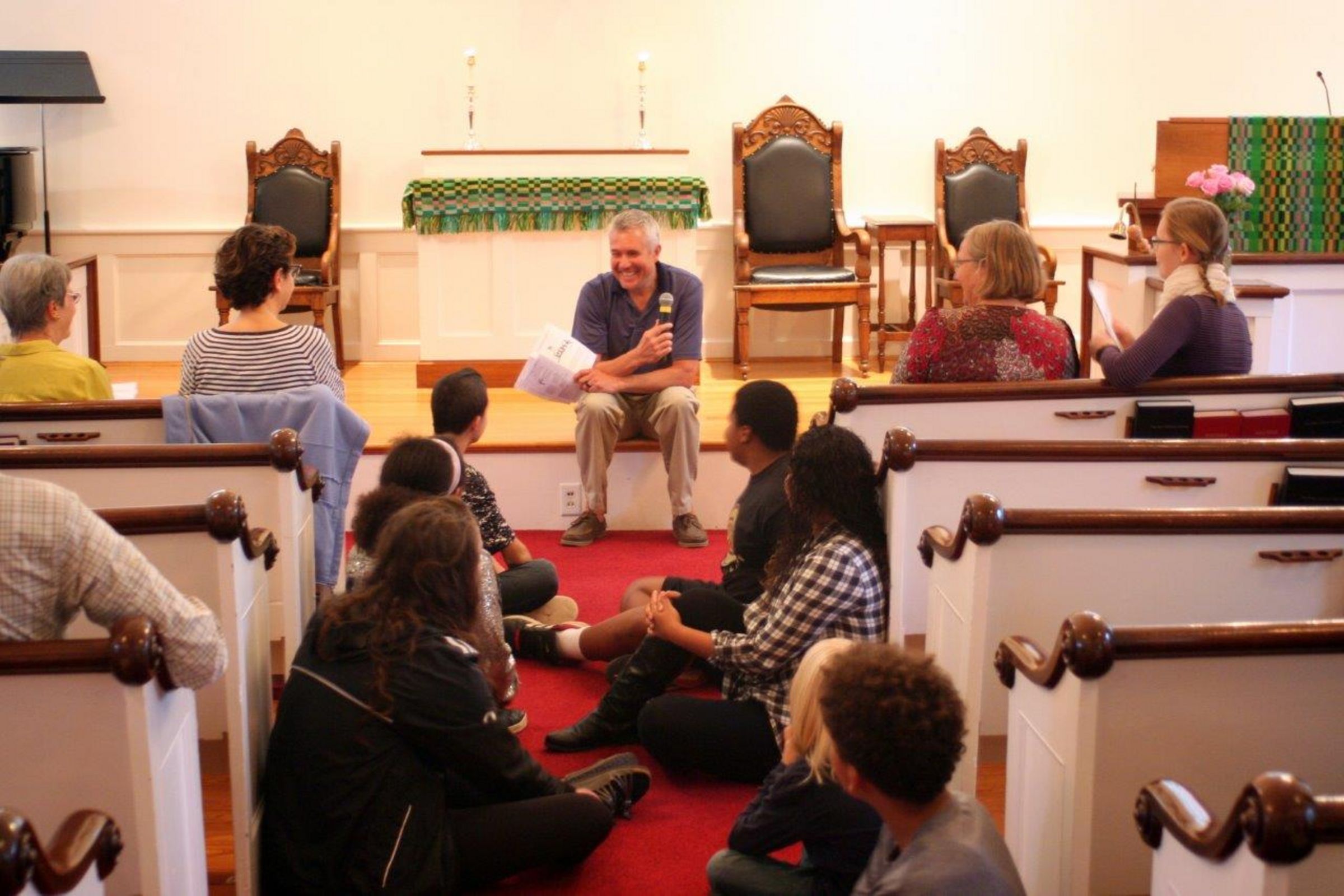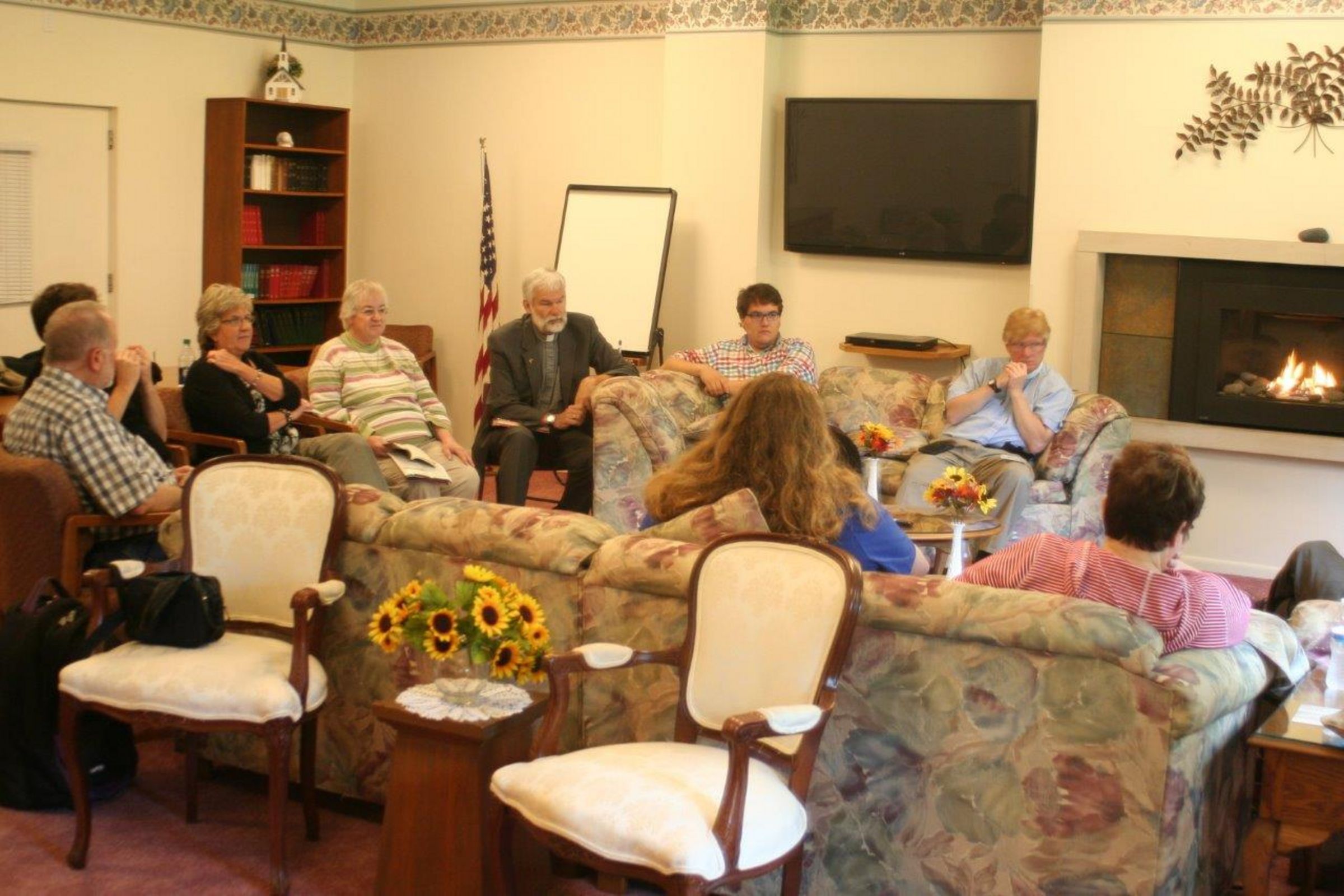 Wir erleben eine lebendige Gemeinde für alle Generationen. Seit vielen Jahren treffen sich immer mittwochs ca. 30 Leute zum gemeinsamen Abendessen. Die Idee ist in der „Not“ entstanden. Peggy erzählt: „Eine Freundin und ich und unsere Kinder hatten am gleichen Abend nacheinander Chorprobe und mussten dazwischen etwas essen.“ So entstand dieses gemeinsame Essen und Quatschen. Hinterher gibt es noch einen kurzen Film, um anschließend darüber zu diskutieren. Wie ich finde, ist dies eine tolle Idee um gemeinsam einen schönen Abend innerhalb der Gemeinde zu haben. Matthias entdeckt inzwischen, wie international diese Gemeinde ist. Mickey (Computerfachfrau) und ihre Tochter Martina kommen aus Taiwan, Jerry (Künstler) aus den USA, Phiwa (UCC-Pastor in St. Louis) stammt aus Südafrika. Vier Kontinente auf einem Foto. Auf Phiwas T-Shirt steht: „Als Christ stehe ich in Solidarität mit meinen muslimischen Nachbarn“ - Trotz der langen Fahrt war es wieder ein schöner Tag!