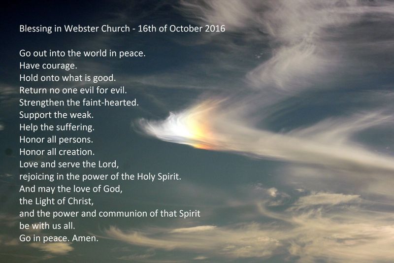 Wir waren in einer Regenbogenkirche zu Gast. Die UCC liebt den Regenbogen. Denn er ist Zeichen für das, was die UCC erbittet und tut in aller Schwachheit und Kraft. That they may all be one - Auf dass sie alle eins seien (Joh. 17,21) – wie die Farben des Regenbogens. Auf der Fahrt vom annual meeting in Flint zu unserem letzten Abendesssen in Michigan entdecke und fotografiere ich das kleine Stück Regenbogen am Himmel inmitten vieler, teils düsterer Wolken. Und am nächsten Morgen in Webster höre ich am Ende des Gottesdienstes den Segen, mit dem dieser Bericht schließen soll: