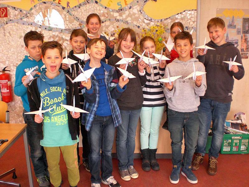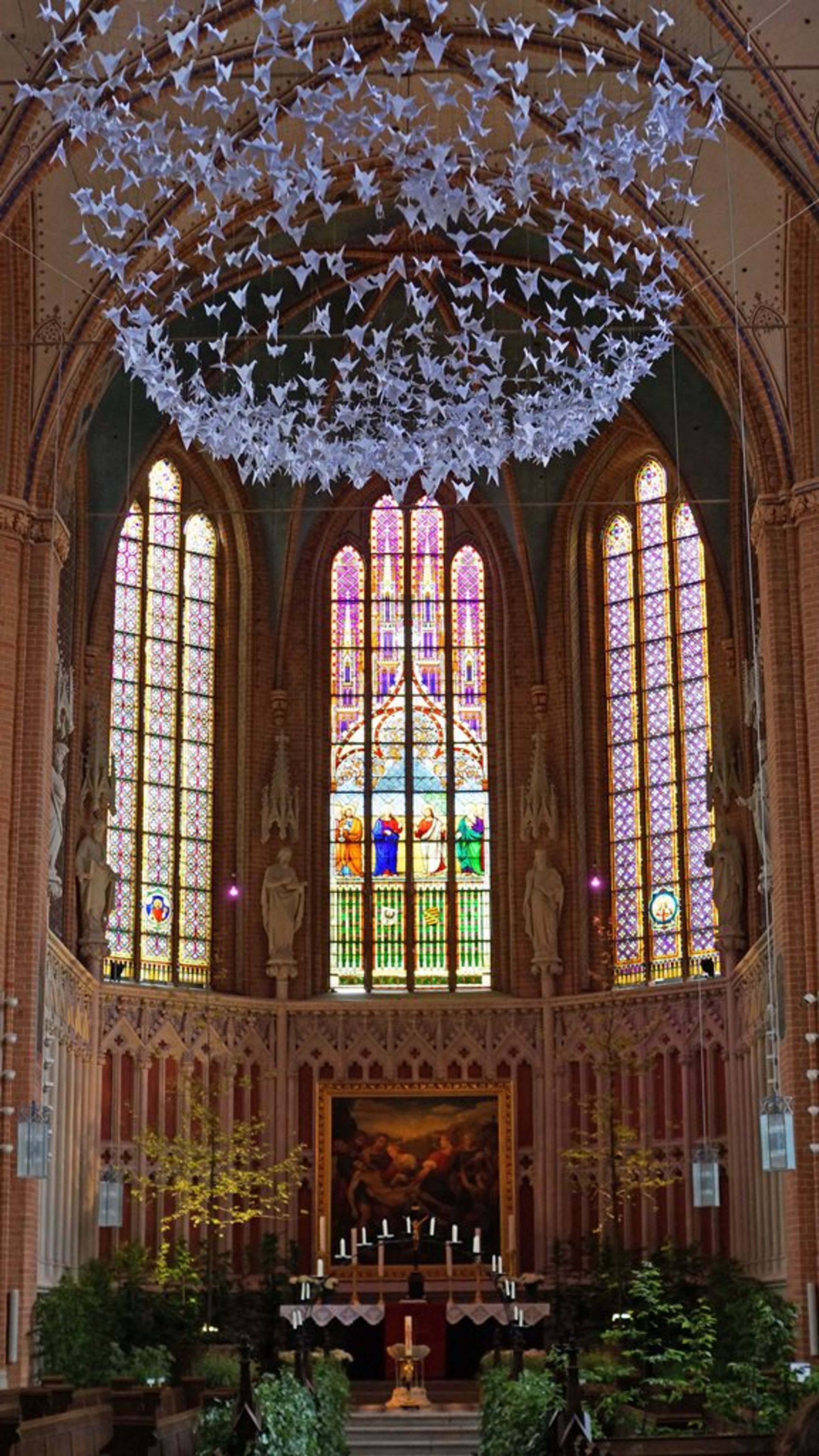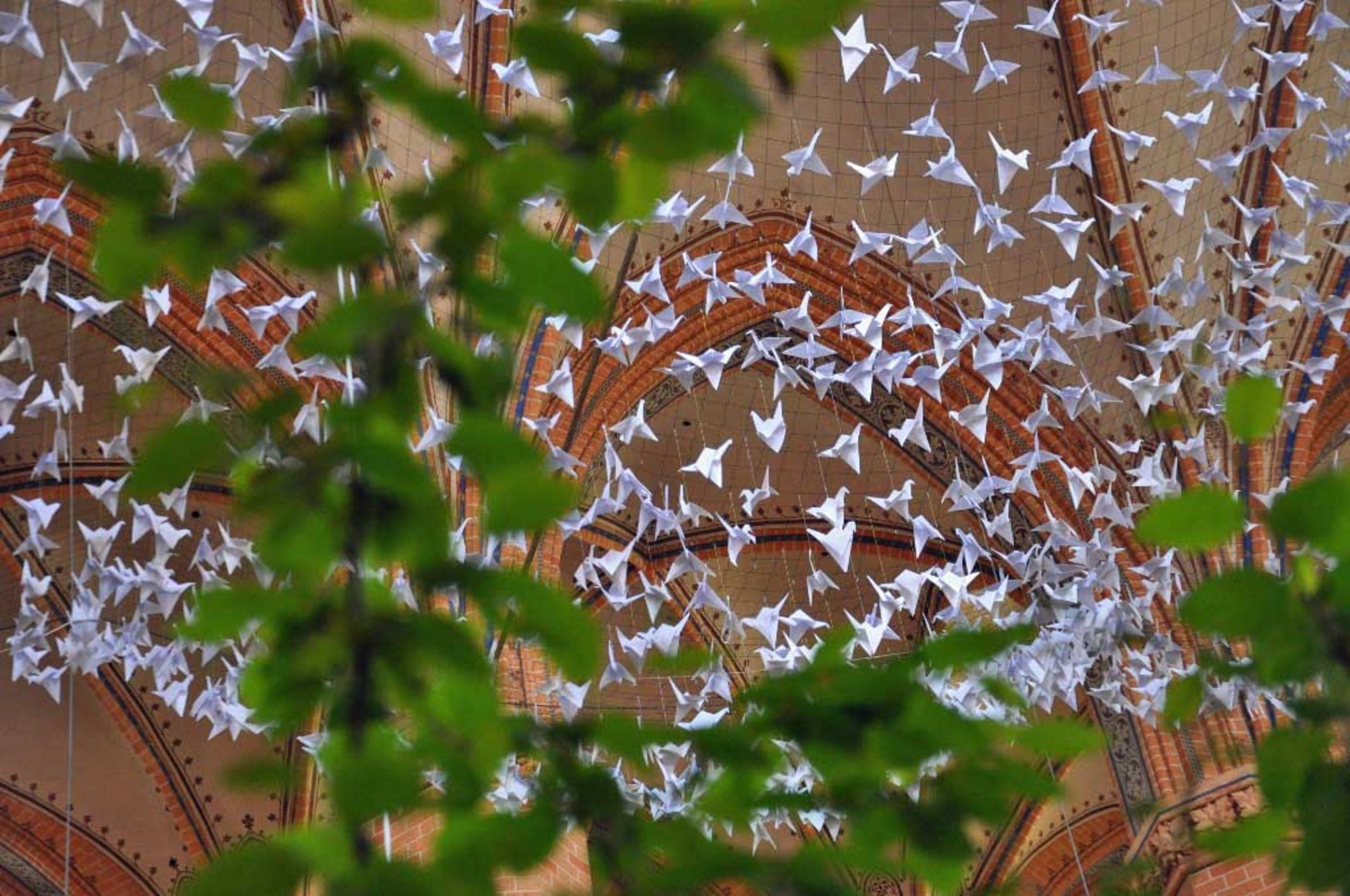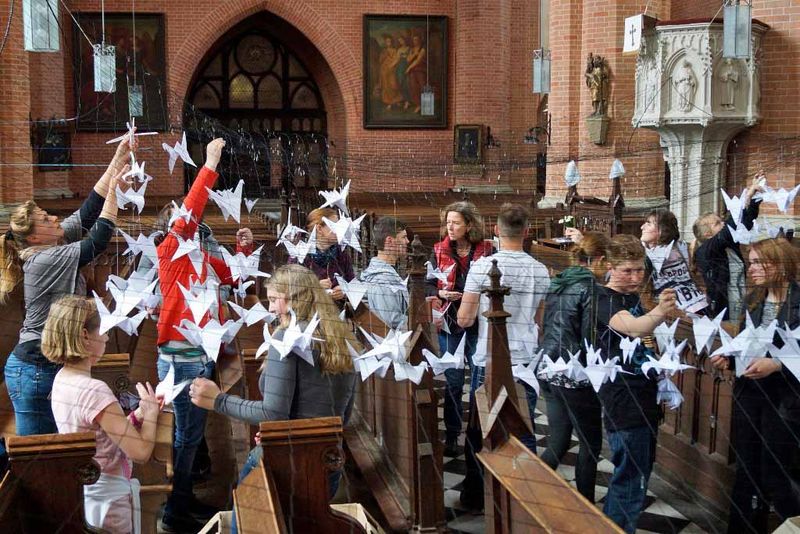 Teil der Installation sind von Schülern der Region aus Papier gefaltete Kraniche, die als Zeichen des Friedens über den Pflanzen und Köpfen der Besucher schweben sollen. Die ca. 1000 Kraniche werden am 12. Mai um 13 Uhr durch Demminer Schüler in der Kirche angebracht.