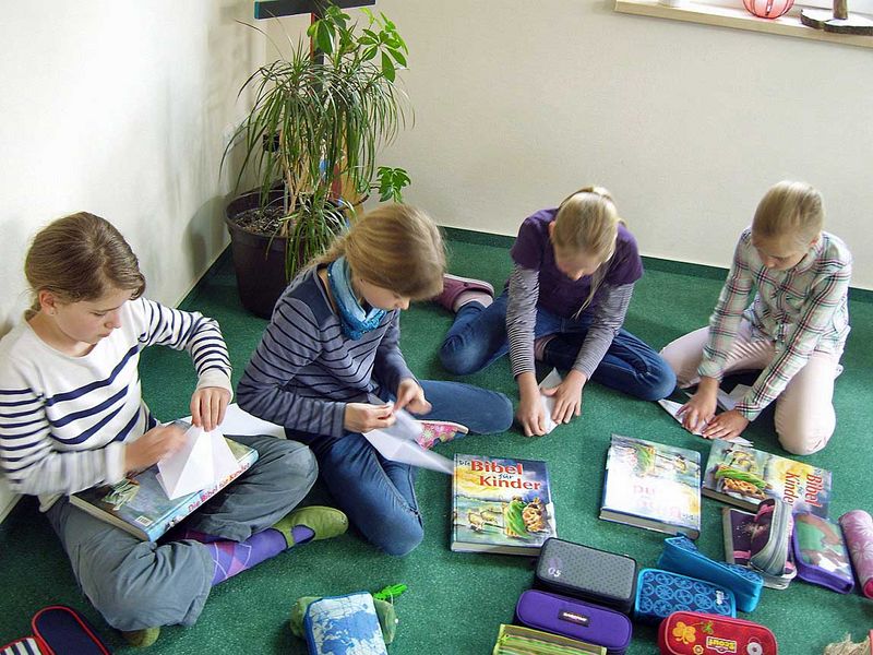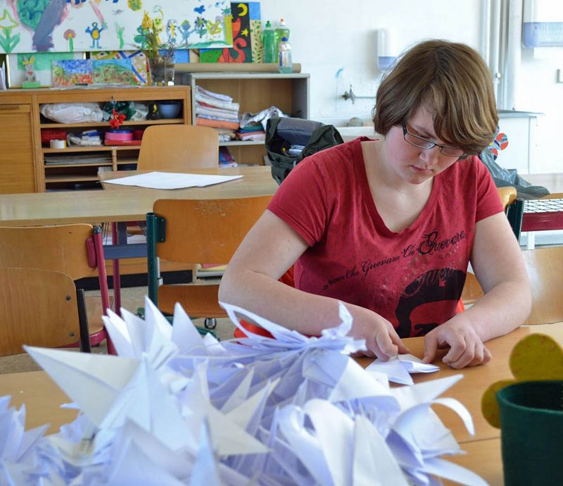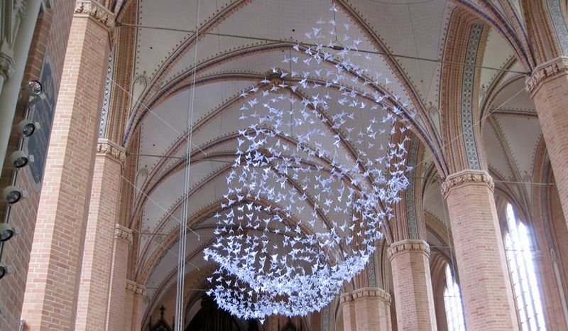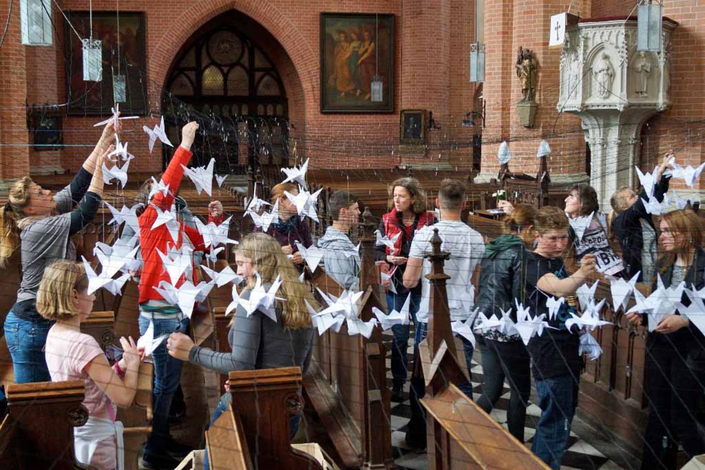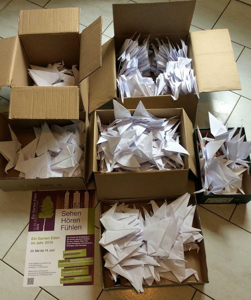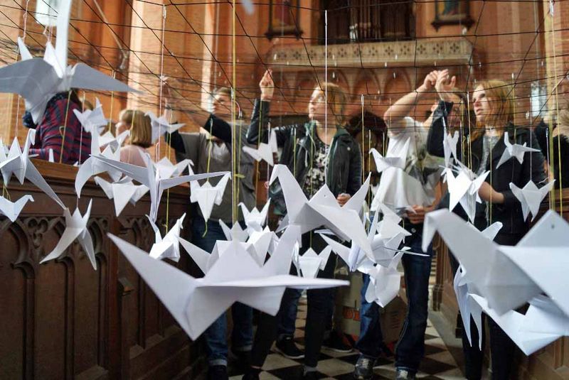 In Vorbereitung der Aufbauarbeiten für „Ein Garten Eden 2015“ wurden am Dienstag 1.000 aus Papier gefaltete Vögel in der St.-Bartholomaei-Kirche in Demmin angebracht. Schüler des Evangelischen Schulzentrums Katharina von Bora halfen beim Falten und bei der Installation der weißen Origamiflieger.07.05.2015 | Kraniche falten
