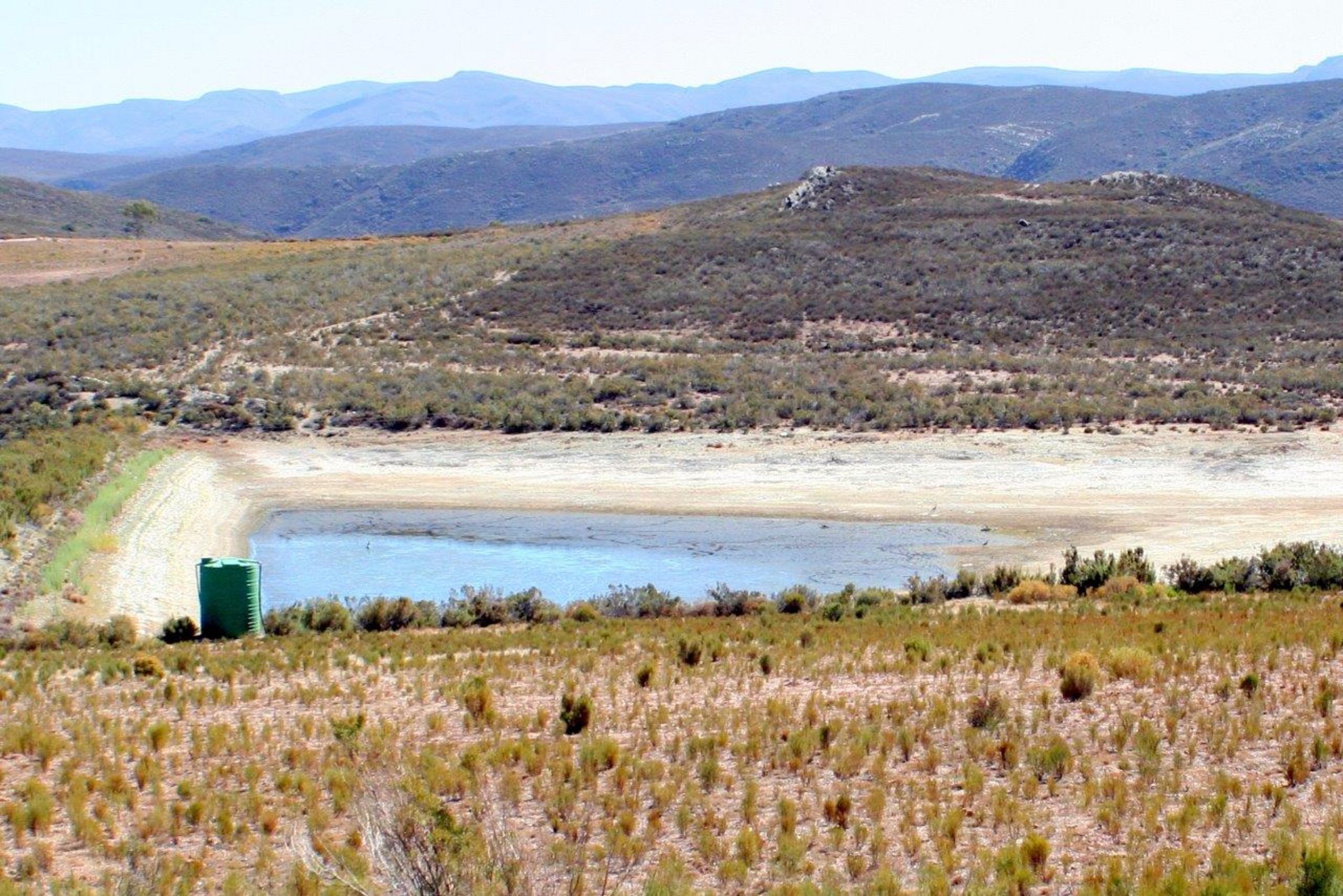 Ein Ausflug in die Berge bei Calitzdorp. Wieder eine atemberaubende Piste am Abhang entlang. Diesmal fahre ich selbst. Langsam macht das sogar Spaß! Unterwegs halten wir oberhalb des Calitzdorper Stausees an. Der Wasserstand ist extrem niedrig. 6.000 Menschen brauchen dieses Wasser für ihr tägliches Leben. Hoffentlich fällt der Regen in diesem Jahr endlich wieder kräftig aus.