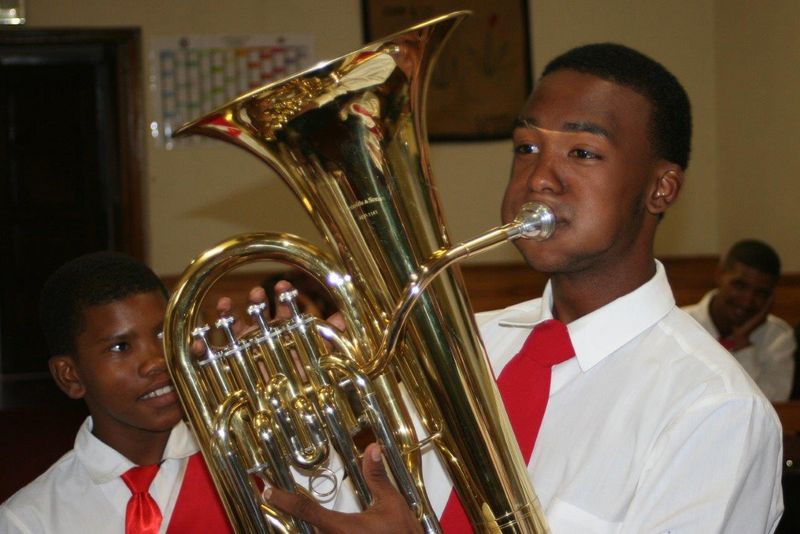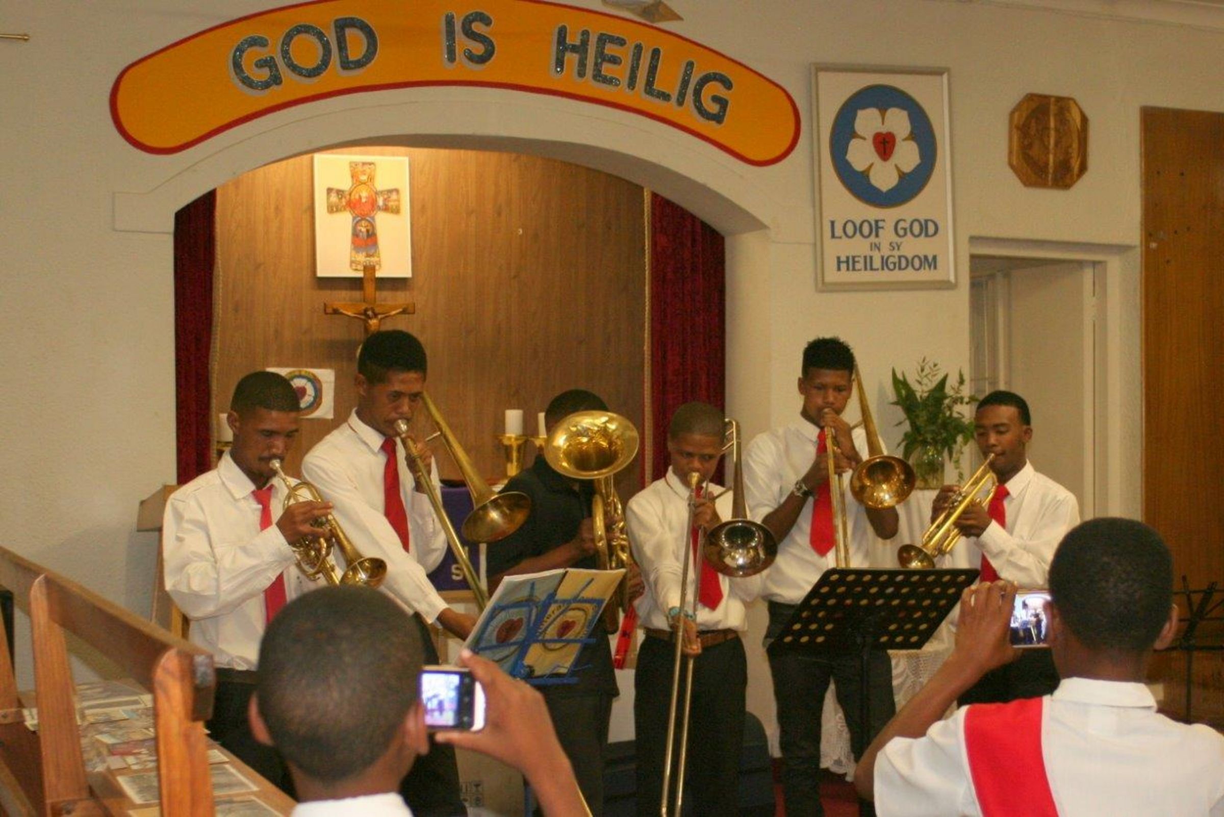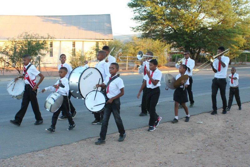 Am Abend sehen wir in Oudtshoorn Kurt Llewayden Jacobs wieder. Im September 2017 war er mit seiner Trompete zum Kirchentag in Greifswald dabei. Und jetzt lernen wir seinen Posaunenchor kennen – die „Lutherische Jugendbrigade Oudtshoorn“. 20 Kinder und Jugendliche mit rotem Schlips und weißem Hemd marschieren die Straße auf und ab und strapazieren Pauken und Blech, dass es nur so eine Art hat. Sie treten auf bei Beerdigungen, bei Volksfesten, bei Feiern jeder Art und natürlich in der Kirche. Es ist eine Freude, diese begeisterten, jungen Gesichter zu sehen, die leuchtenden Augen. Wie stolz sie zeigen, was sie können! Und es klingt richtig gut! Ich habe ein Euphonium aus Pommern mitgebracht, neugierig und eifrig packen die Kinder es aus, und Kurt darf ihm die ersten Töne entlocken.