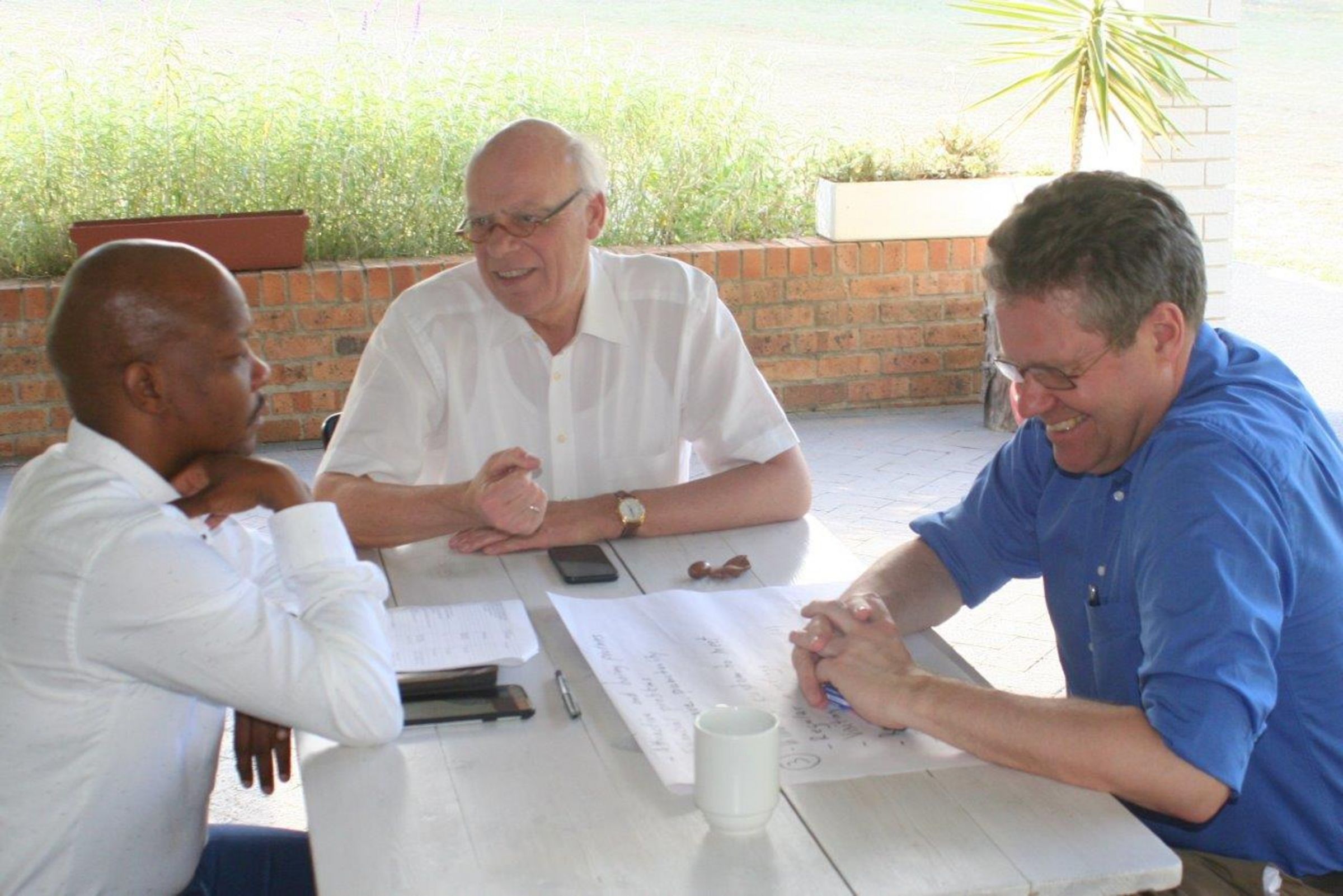 Die Cape Orange Diocese arbeitet mit der Moravian Church und der Ethiopian Episcopal Church zusammen, daher war es Bischof Manong wichtig, dass wir die Bischöfe dieser beiden Kirchen ebenfalls kennenlernen. So waren wir zur Kaffeezeit zu einem einstündigen Gespräch mit den Leitern dieser Kirchen verabredet. Bedingt durch Verkehrsstau, in dem Brian Abrahams, der Bischof der Moravian Church feststeckte, mussten wir das Gespräch mit Dallis Ntlokwana, dem Bischof der Ethiopian Episcopal Church allein beginnen. Ntlokawana hat uns seine Kirche vorgestellt und wir haben gelernt, dass der Name nicht auf einen Ursprung aus dem Land Äthiopien hinweist; ‚Ethiopian‘ ist hier als traditioneller Name für Subsahara-Afrika zu verstehen. Der Name weist darauf hin, dass diese Kirche nicht von Missionaren von außerhalb gegründet worden ist, sondern innerhalb des Landes entstanden ist, wobei sie lange eng an die Anglikanische Kirche angelehnt war.