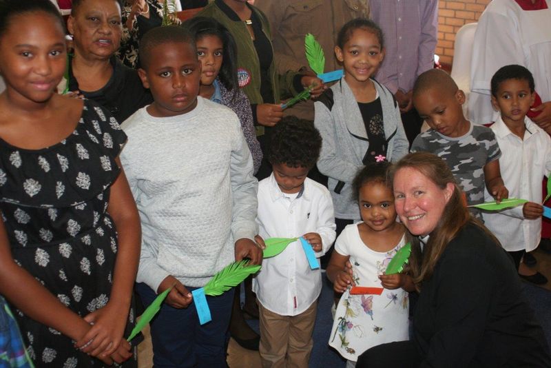 Wer es nicht ohnehin gewohnt ist, dem fällt es gar nicht auf, dass der Gottesdienst fast drei Stunden dauert. Kurzweilig und berührend zugleich feiern wir ihn. Viele kleine Details tragen dazu bei: Das Evangelium wird in einer kleinen Prozession mitten in die Gemeinde getragen und hier gelesen. Junge Mädchen in farbenfrohen Gewändern gestalten den Gottesdienst als Helferinnen mit. Die Kinder, selbst die kleinsten, kommen zum Abendmahl. Helga Warnke hält ein fröhliches Grußwort der Nordkirche und verteilt von Löcknitzer Schulkindern gebastelte Palmen an die Kinder und Jugendlichen der Gemeinde. Die junge Ortspastorin Allison Harwood beeindruckt durch ihre Klarheit, Souveränität und heitere Gelassenheit. Ein fantastisches Saxophon begleitet die Lieder – und eine manchmal etwas laute Gitarre. Und ein paar engagierte Frauen („Die sind aus der Kalahari zugezogen!“) bringen richtig Schwung in die Lieder. Der große Gottesdienstraum ist fast voll. Erst das ein oder andere Magenknurren lässt im wahrsten Sinne aufhorchen. Doch auch hier ist natürlich vorgesorgt: Die Gemeinde entlässt uns nicht ohne ein reichhaltiges Mahl und schon gar nicht ohne eine Vielzahl toller Eindrücke. Natürlich erst nach der Fotosession! Dankie liewe Gemeende!