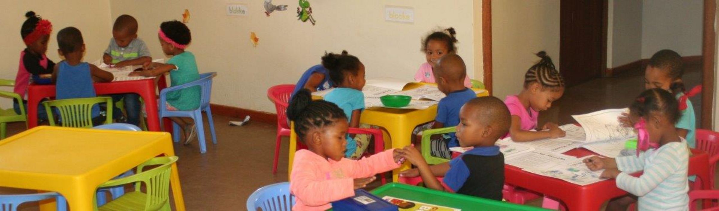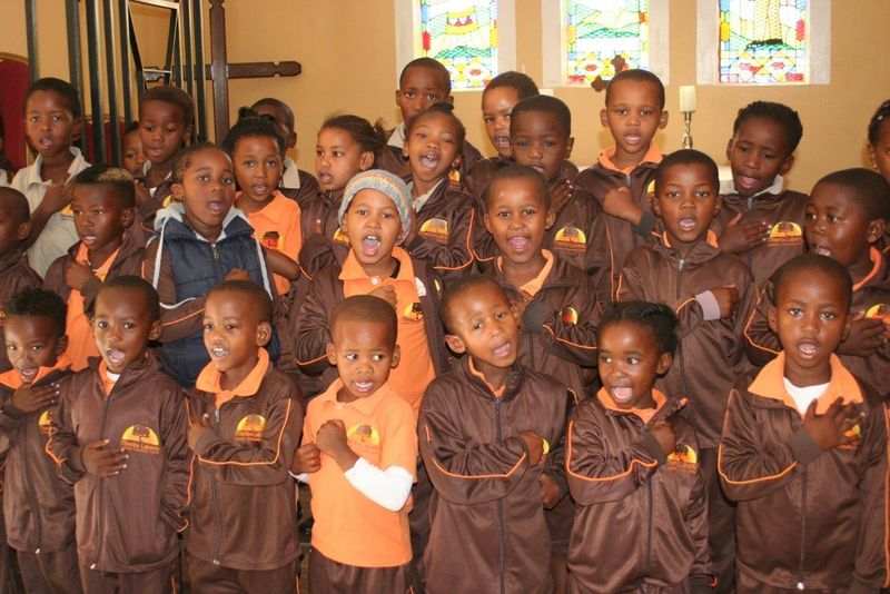 In der Kirche von Dysseldorp (Disteldorf) begrüßen uns fröhliche Kinderstimmen. Tagsüber ist hier der lutherische Kindergarten. Der große Raum wird durch die Stühle in mehrere kleine Räume unterteilt, damit alle 52 Kinder zwischen anderthalb und fünf Jahren zu ihrem Recht kommen und auch mal in kleinerer Gruppe ihr Programm haben können. Der Kindergarten wurde 2012 eröffnet, erzählt uns die Leiterin Heidi Booysen. Sie hat vorher als Verkäuferin in Mossel Bay gearbeitet, aber dann konnte sie eine Ausbildung zur Erzieherin absolvieren. Mit drei weiteren Erzieherinnen und einer Köchin sorgt sie für die Kinder. Einen großen Teil der Kosten trägt der Staat. Viele Eltern der Kinder sind arbeitslos und können keine Kindergartenbeiträge zahlen. Die aber Arbeit gefunden haben, sind weit weg, in Kapstadt zum Beispiel, und kommen alle zwei Wochen oder gar seltener nach Hause. Die Kinder wachsen bei Großeltern, Onkel, Tanten auf. Gut, dass sie auch hier in der Kirche eine Heimat haben!