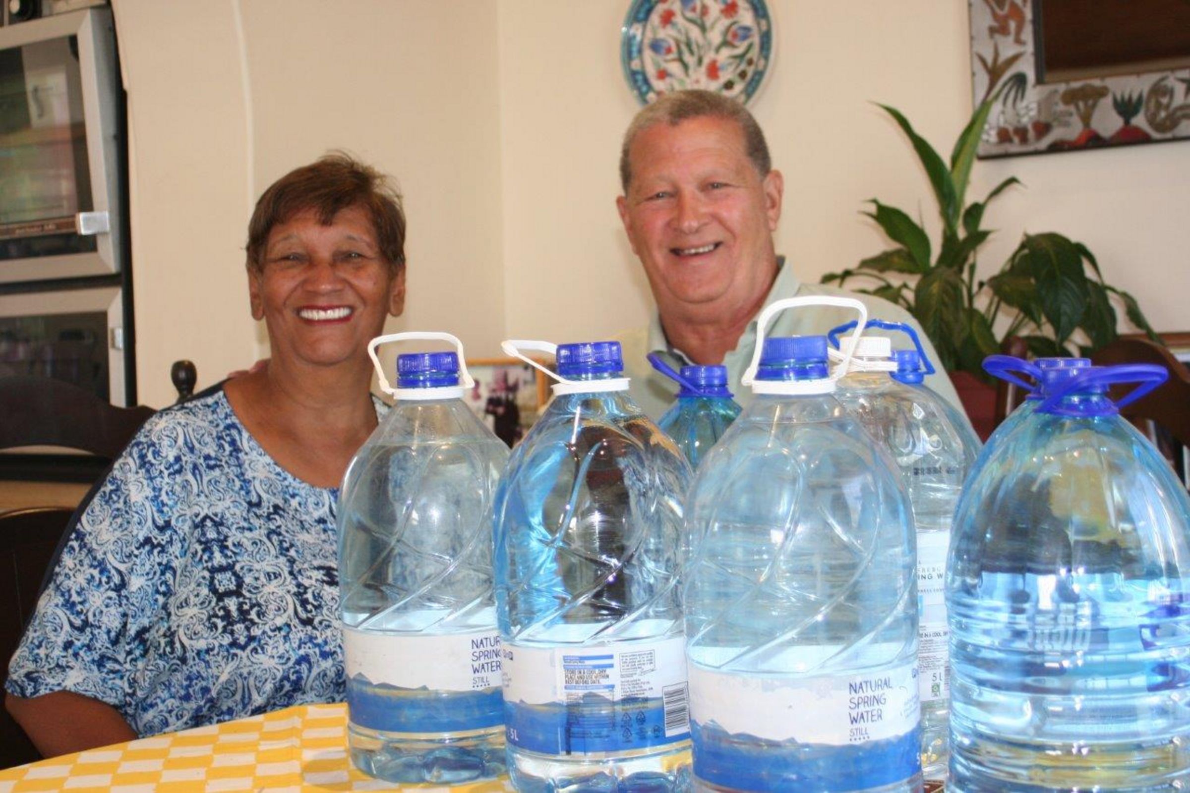 Szenenwechsel. Grassy Park. Ferdinand „Ferdi“ Groenewald und seine Frau Rheena freuen sich, dass ich wieder einmal an ihrem Tisch sitze. Ferdi war Lehrer, nach seiner Pensionierung ist er ehrenamtlicher Pastor geworden – schon vor vielen Jahren. Drahtig wie er ist, hilft er heute noch aus. Das Jugendzentrum Athlone, das viele Übernachtungsplätze für Reisegruppen mit Vollpension anbietet, managt er immer noch und arbeitet sogar Tagesplanungen für die Besucher aus, besorgt Busse… „Nur noch dieses Jahr!“ erklärt er mir. Seine Frau lacht ihn aus. „Das sagst Du jedes Jahr!“ Im Frühjahr 2002 war Ferdi Gast des Neubrandenburger Kirchentages, seither gab es viele Begegnungen. Er erzählt mir vom Brunnen hinter seinem kleinen Haus. Der wurde schon vor 35 Jahren gebohrt und versorgt das Haus teilweise mit seinem Wasser. Trotzdem hat Rheena viele 10-Literflaschen mit Trinkwasser gekauft, für alle Fälle. Dieses Motiv kann man sich als Fotograf nicht entgehen lassen!