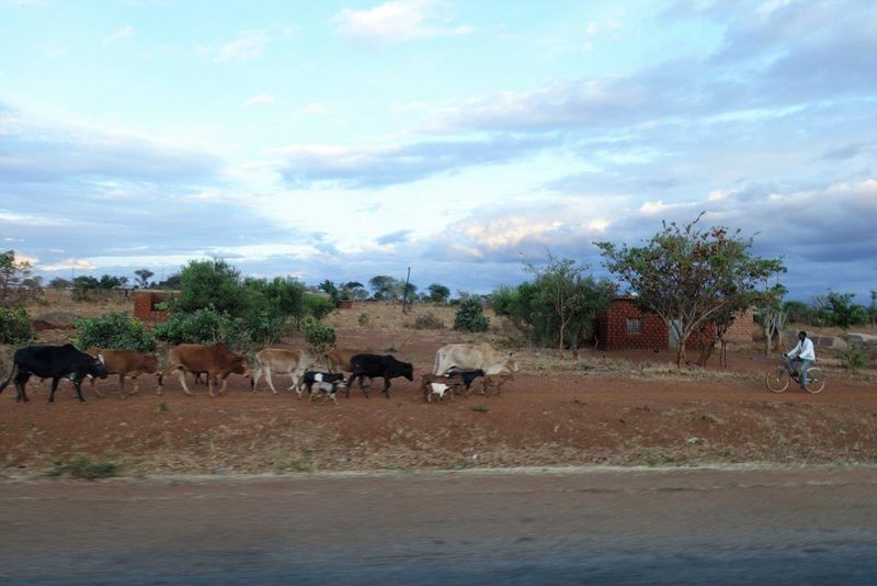 Als wir die Arusha hinter uns gelassen haben, verdoppelt sich die Reisegeschwindigkeit; statt mit höchstens 50 km/h geht es jetzt mit 80-100 km/h voran. Pole pole scheint im Straßenverkehr nicht zu gelten. Wir fahren vorbei an einer Schlangenfarm und Massai-Dörfern mit ihren runden Schilfhütten. Ihre Rinder- und Ziegenherden am Straßenrand zwingen unsern Fahrer mitunter zum Bremsen.