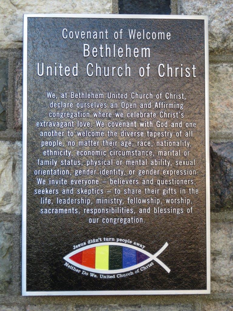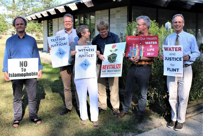 Wir lernen, dass die UCC unter ihrem Dach evangelikale, konservative Gemeinden vereint mit sehr liberal- progressiven. Das Amt des Conference Ministers ist es vor allem, diese bunte Vielfalt zusammenzuhalten, Netzwerke zu schaffen und für die Programme der Zentrale zu werben, die Bildung, Seelsorge, Mission und anderes umfassen. Kirchenpolitische Macht im engeren Sinn hat er nicht. So überrascht das Motto der UCC nicht: nach Joh. 17 eins zu werden in Jesus Christus. Am Ende des Gesprächs steht ein Gruppenfoto mit den Kampagnen der UCC. Gern nehmen wir diese Schilder in die Hand.