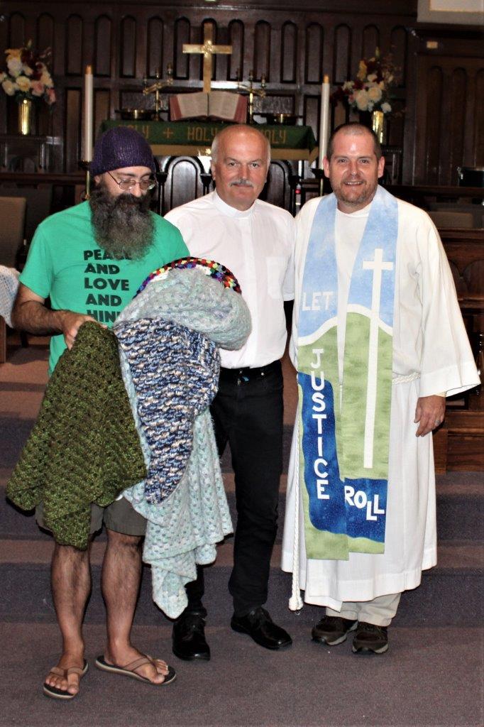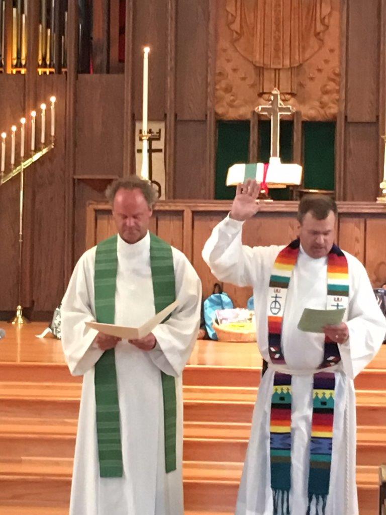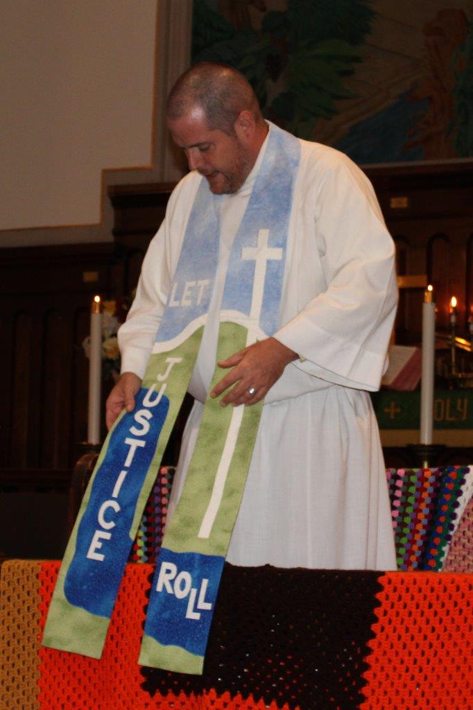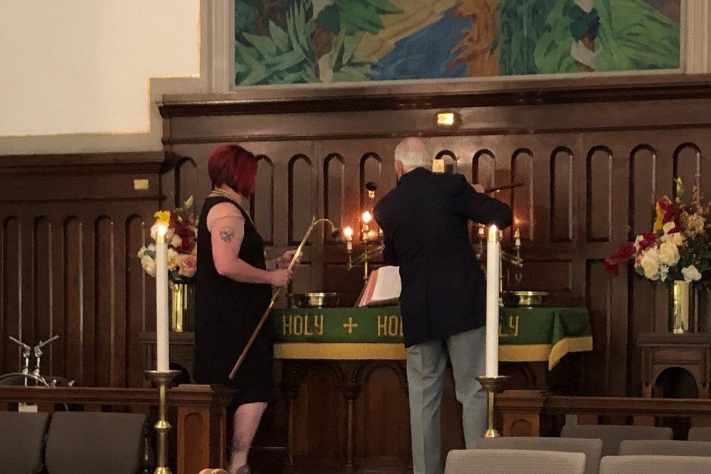 10:30 Uhr Gottesdienst in St. John. Unsere „Heimatgemeinde“! Auch diese Gemeinde ist open and affirming – also offen für alle Menschen jeder Couleur. Und spätestens, als die Altarkerzen entzündet werden, sehen wir, dass das nicht nur eine fromme Erklärung ist. Ein älterer weißer Herr – und Kathy, die wir schon aus ihrem Küchendienst kennen, nehmen das in die Hand. Sehen Sie selbst! Eine Ehrenamtliche leitet den Gottesdienst. Daniel Kidder-McQuown sieht in seinem weißen Gewand mit der dicken Kordel wie ein Arbeitermönch aus. Gerührt zeigt er die Stola, die er als Dankeschön für die Dienste seiner Gemeinde während unserer Konferenz erhalten hat. „Let Justice roll!“ Lass Gerechtigkeit fließen!