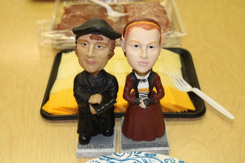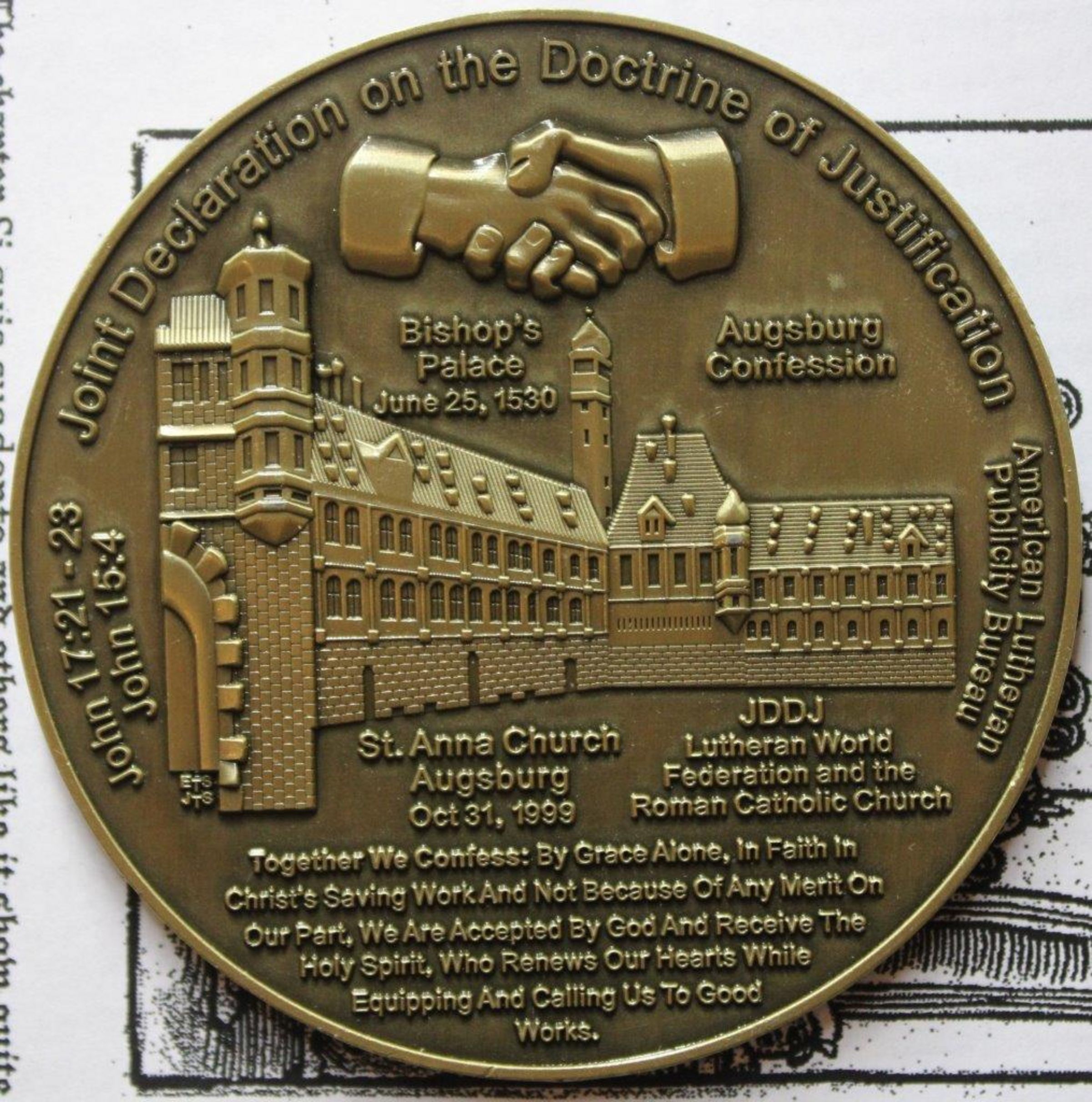Wie uns Professor Klein eine Jubiläumsmünze der ELCA zum 500. Jahrestag der Reformation zeigt. Sie erinnert an 1999 – an die gemeinsame Erklärung zur Rechtfertigungslehre durch die Lutherische und die Römisch-katholische Kirche. 482 Jahre war die Rechtfertigungslehre das Dokument und Fundament der Trennung. Seit 18 Jahren bezeugen wir, dass uns die Rechtfertigungskehre nicht trennt, sondern eint. Ein fröhlicher Martin Luther und ein genauso fröhlicher Papst Franziskus blicken auf den Betrachter. - Aber nun schauen Sie sich mal die Rückseite der Münze genau an. Da entdecke ich etwas ganz Verrücktes. Sie auch?