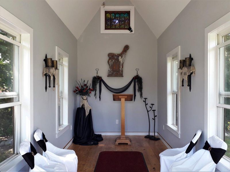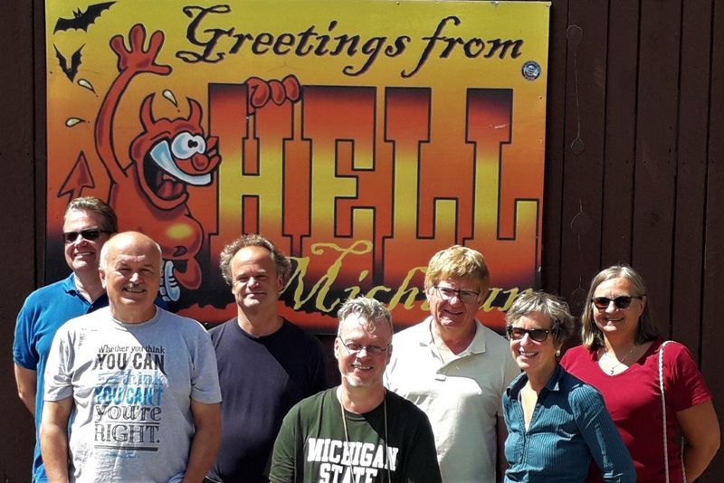 In der Mitte des Tages aber haben wir die Hölle besucht! Ganz in der Nähe gibt es den kleinen Ort Hell (Hölle). Mehrere Gaststätten mit kuriosen Mahlzeiten. Ich bestelle „Fallen Angel“ – Gefallener Engel. Ein Wrap mit ziemlich scharfer Soße – eben höllisch. Es gibt T-Shirts zu kaufen mit Gruselsprüchen, Fledermäuse und Spinnen grüßen grimmig von der Decke. Auf dem Gelände eine zwergenkleine Kapelle, und ein Brautpaar, offensichtlich getraut (???). Die Braut hat sich zwei kleine Hörner aufgesetzt! Ziemlich schräg, oder? Als die Hochzeitsgesellschaft das Gelände verlassen hat, schauen wir uns den Ort des Geschehens genauer an. Ein Spruch auf der Seitenwand erklärt: „Mit einer Ehe, die in der Hölle geschlossen wurde, kann es nur aufwärts gehen.“ Amerikanischer schwarzer Humor.