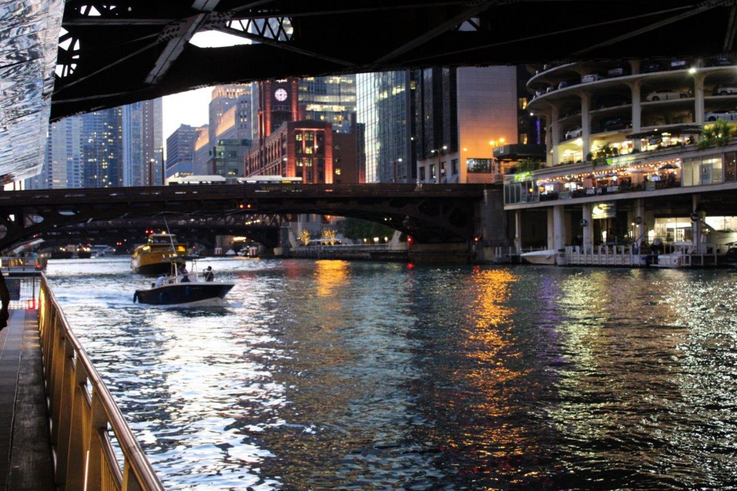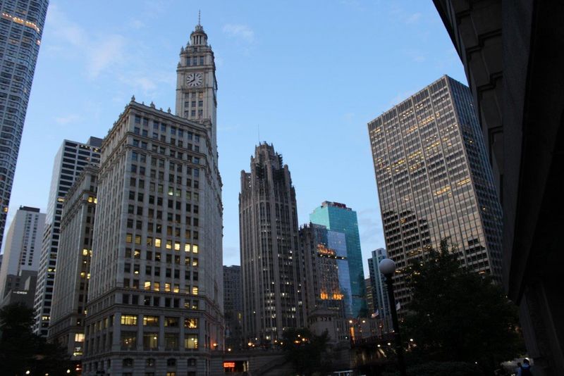 Abends machen wir uns mit der Blue Line, die über weite Strecken als Hochbahn über die Straßen Chicagos rattert, auf den Weg in die Innenstadt. Auf dem „Chicago Riverwalk“, direkt am Wasser, lassen wir uns einfangen von der Faszination einer wunderbaren Architektur, der Ästhetik der Hochhäuser, der Brücken und des smaragdgrünen Wassers. Uns umfängt eine heitere Atmosphäre und nach dem Dunkelwerden ein Lichtspiel, das die Glasfassaden und den Fluss golden glänzen lässt. Dann noch ein Snack zum Abendessen und ein kühles Chicago-Bier. Und wir fahren erfüllt und müde ins Hotel zurück.