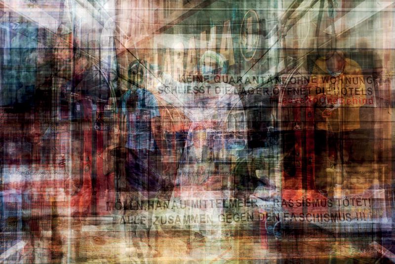 „Covid 19 Woche 0-VI“ ist ein siebenteiliger Archival Pigment Print. Jedes Bild besteht aus mehreren hundert übereinandergelegten Bildern, die in der jeweiligen Woche weltweit in den Medien veröffentlicht wurden.