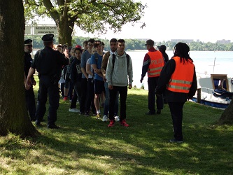 Ein bißchen nachempfinden. Sich das vorstellen können – darum ging es am 11.Juni, als ca. 120 Schüler und Schülerinnen mit dem Schiff auf die Insel Kaninchenwerder im Schweriner See kamen. 'Flüchtling für einen Tag' sein war die Herausforderung – mit dem, was zum Flüchtlingsein gehört: Grenzkontrollen, Ankommen in der Erstaufnahmeeinrichtung, Besuch in der Ausländerbehörde, erste Erfahrungen im Sprachkurs, Kontrollen durch die Polizei auf der Straße, Unterbringung in einer Gemeinschaftsunterkunft, Jobcenter, Abschiebehaft und Ausreisezone – das Schweriner Netzwerk Arbeit für Flüchtlinge (NAF) hatte zusammen mit vielen Aktiven die einzelnen Stationen auf der Insel aufgebaut. Die wurden dann reihum von den Jungs und Mädchen aufgesucht. In der Schule war das Projekt mit LehrerInnen vorbereitet worden. Es war beeindruckend zu erleben, wie die “Flüchtlinge für einen Tag“ sich in ihre Rolle hineinbegaben, sich identifizierten mit den ihnen zugewiesenen Schicksalen.