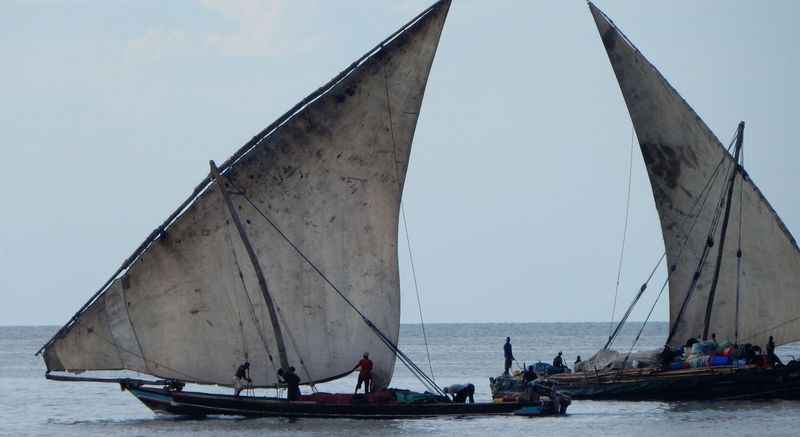 Der abendliche Blick auf den Hafen von Stone Town ist unvergleichlich, fast magisch bei Sonnenuntergang, obwohl es laut und lebhaft zugeht. Ein Frachter wird mit Containern beladen. Fähren aus Dar es Salaam laden Touristen ab, nehmen neue an Bord. Wendige Wassertaxis bahnen sich den Weg durch das Gewirr… Nur eine Art von Schiffen ist ohne alle Hektik: Große Kähne mit ihren dreieckigen Segeln kommen geräuschlos heran oder passieren den Hafen, wie in Zeitlupe. Seit Jahrhunderten wird die Dhow für den Transport von Menschen und Waren genutzt, auch für Menschen als Waren. Die Dhow gehört untrennbar zu Sansibar, zu seiner Geschichte.