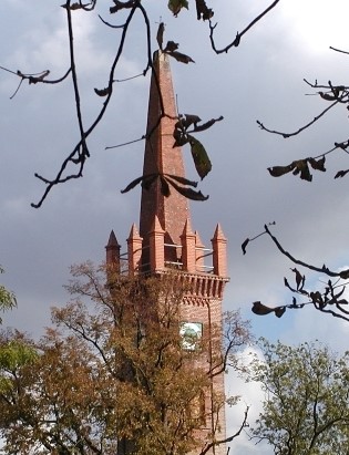 Er trägt oben eine kräftig, auf Konsolenfries vorgesetzte Plattform und eine schlanke vierseitige Pyramide mit Kugel und Kreuz.