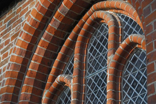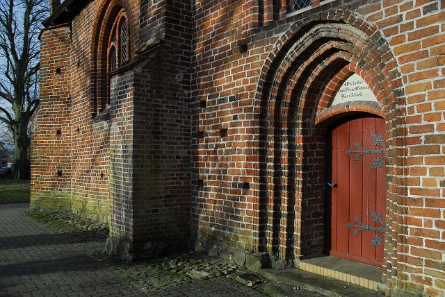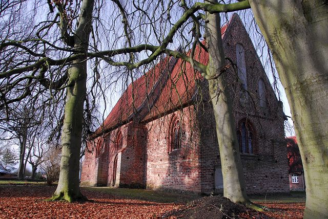 Die Kirche ist ein gotischer Backsteinbau mit Strebepfeilern versehen, was auf ein geplantes oder ehemals vorhandenes Gewölbe hinweisen kann. Innen ist die Kirche jedoch flach gedeckt. Die Außenwände des glatt abschließenden Chores weisen eine Abwechslung von glasierten und nichtglasierten Ziegelschichten auf. Oben auf dem Dach befindet sich ein Stromschichtfries. Am Kirchschiffgiebel zum Chor findet sich aber auch Fachwerkarbeit. Am Giebel sind drei spitzbogige Blenden, die erneuert und nicht mehr ursprünglich sind. Die Laibung des Portals zeigt derbe und breit abgefaste Kanten, das Portal auf der Südseite hat feiner ausgebildete Profilierungen. Am Westgiebel weist das Mauerwerk auf einen geplanten oder möglicherweise sogar einst vorhandenen Kirchturm hin.