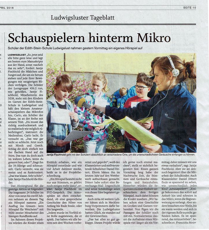 Das Hörspiel wie das Feature (...mehr dazu) sind Kunstgattung, die durch das gesprochene Wort wirken, die Phantasie anregen wie das Lesen eines Buches. In einem Projekt – für eine Schulklasse z.B. - ein „Drehbuch“ für ein Hörspiel zu schreiben, fördert die Kreativität, den Teamgeist und die Medienkompetenz der Schüler. Auch das Sammeln der O-Töne stellt hohe Anforderungen an die die deutsche Sprache. Nicht umsonst bemüht sich der Norddeutsche Rundfunk sehr um diese Kunstgattung und fertig jedes Jahr mit ausgewählten Schulklassen Hörspiele. (...mehr dazu)Der Umgang mit der modernen digitalen Technik schult Medienkompetenz. Mikrofone, Aufnahmegeräte, Laptops mit Schnittmöglichkeiten und eine schallisolierte Aufnahmekabine sind vorhanden. Selbstverständlich WLAN.