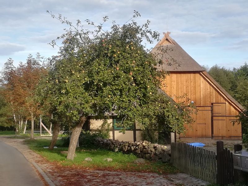 Gebaut um 1705, rekonstruiert und modernisiert 2017 bis 2018. (Den Weg hierher können sie nachlesen) Jetzt bin ich eine Hörspiel-und Begegnungsscheune. Ich habe ein schönes neues Reetdach, behindertengerechte Sanitäranlagen, eine Top-Küche mit ganz viel Geschirr und eine hochwertige technische Ausstattung. Auch sorgt eine moderne UV-Heizung für eine angenehme Temperatur.