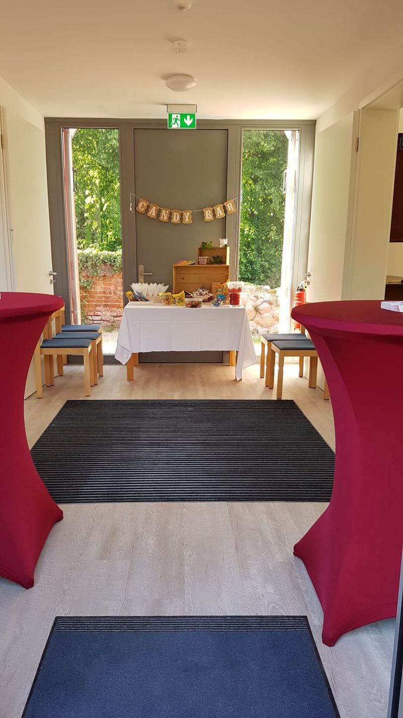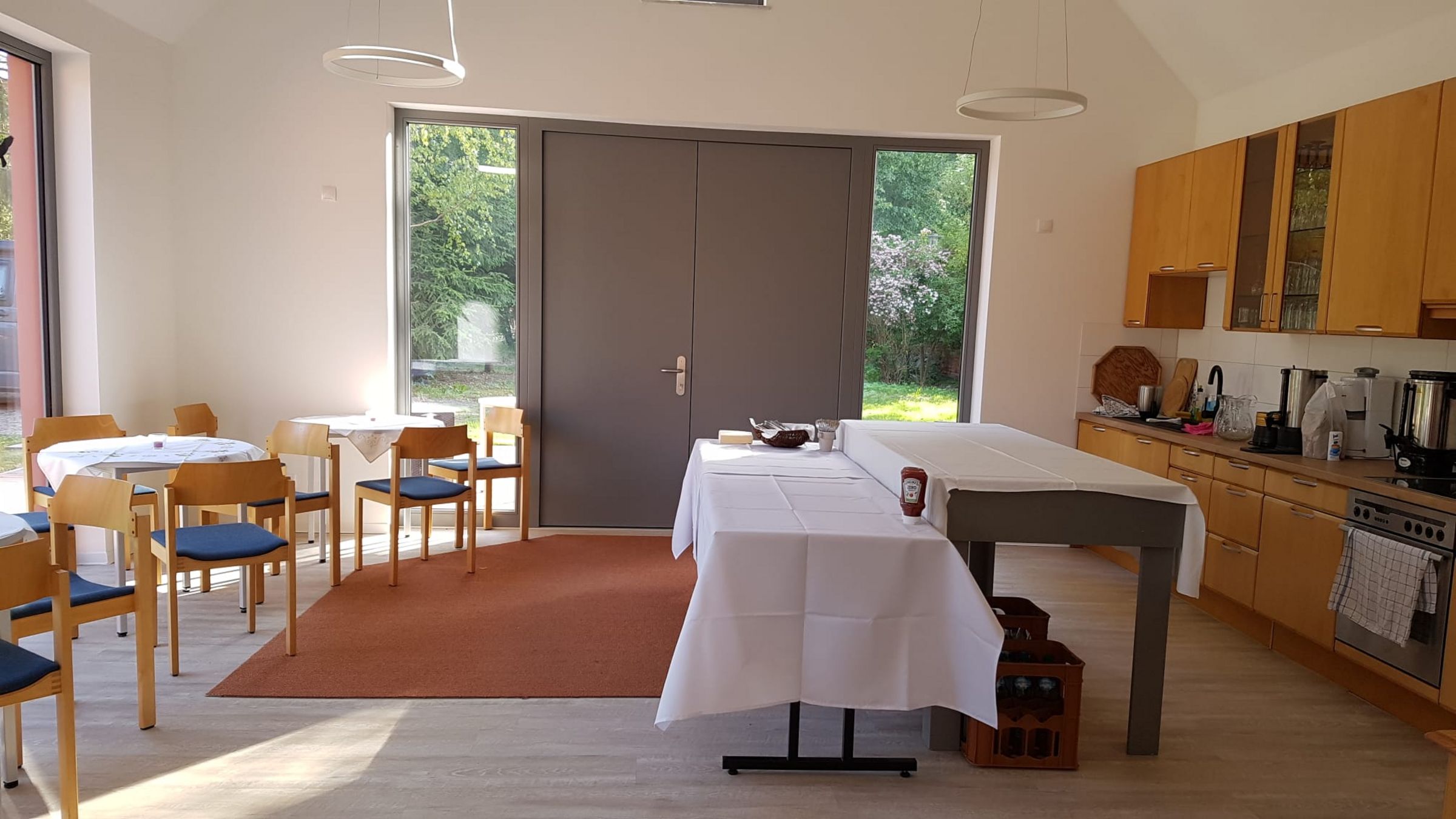 Das Gemeindehaus verfügt über eine voll ausgestattete offene Küche mit Café-Einrichtung, eine Terrasse, einen großen Gemeinderaum und sanitäre Einrichtungen. Es bietet bis zu 60 Personen Platz.