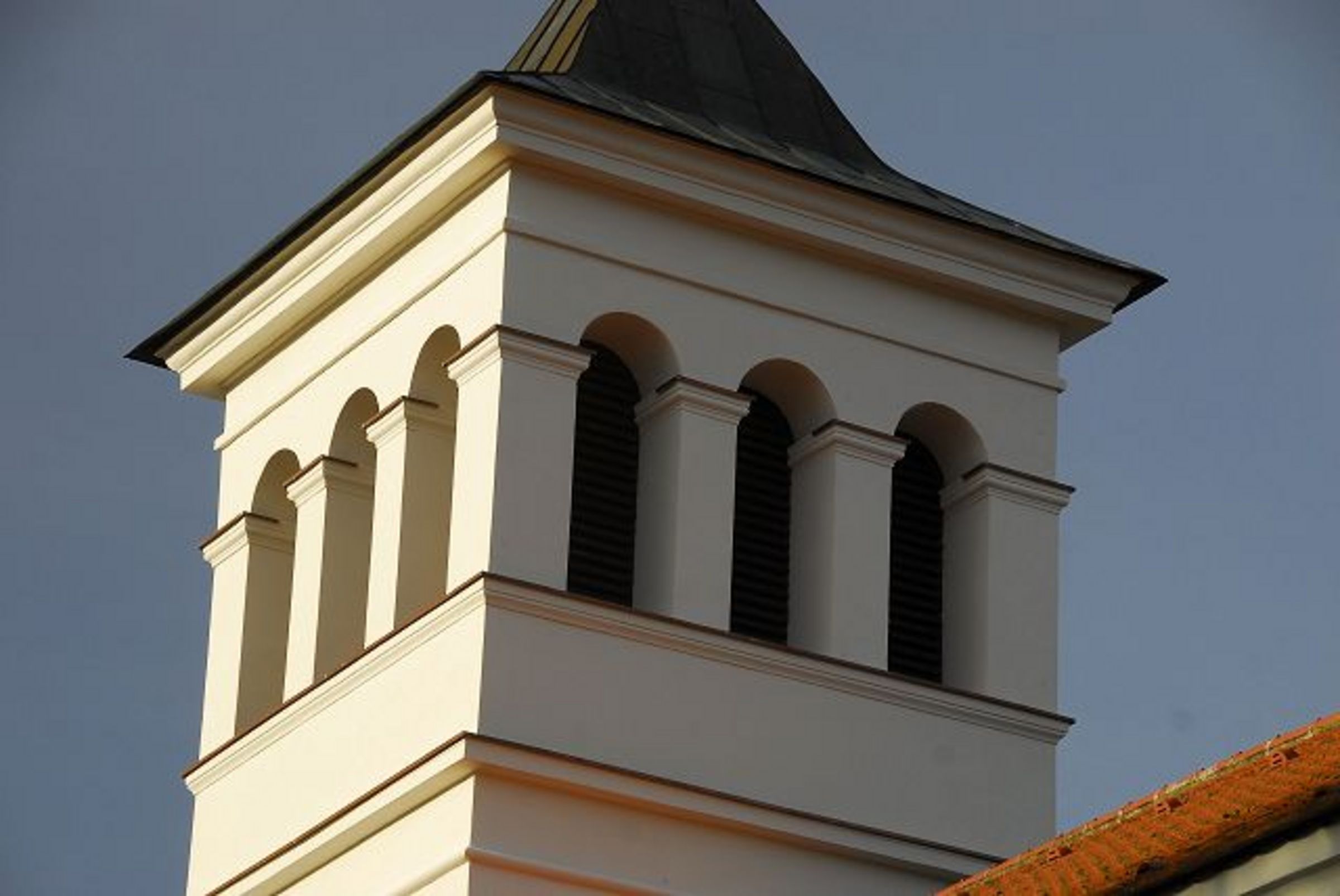 einem Turm mit Glocke und vergoldetem Kreuz ausgeführt.