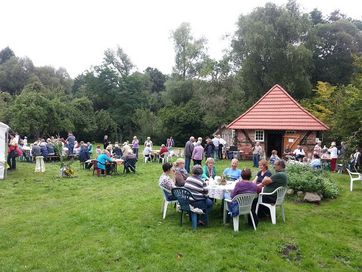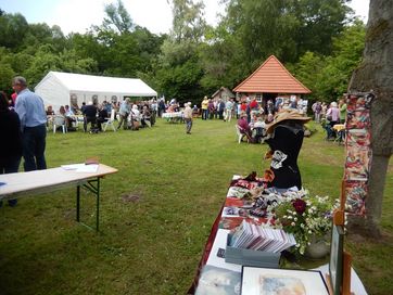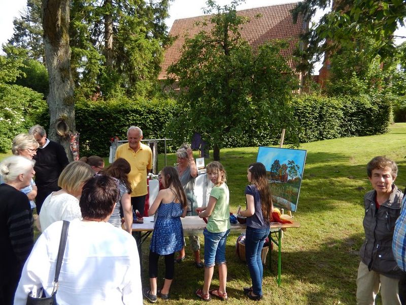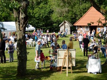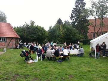 Nun schon traditionell feierte der Förderverein "Kirche und Pfarrhofensemble Cramon e.V." am Sonnabend nach Johanni ein schönes Fest im Pfarrgarten. Das Wetter spielte ganz hervorragend mit und viele Besucher erfreuten sich an frisch gebackenem Kuchen, Brot, Deftigem vom Grill und Live Musik. Der Reinerlös inclusive der Versteigerung eines Bildes, das der Schweriner Maler Axel Thierock für die Rettung der Pfarrscheune gespendet hatte, betrug mehr als 1.300 Euro.