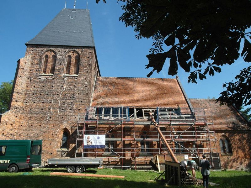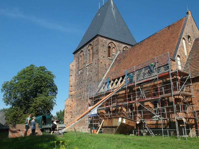 Das Gerüst steht: Ende Juli wurden die Arbeiten zur Restaurierung von Dach und Außenwänden des Kirchenschiffes der Kirche zu Kirch Stück aufgenommen. Die Öffnung des Daches brachte wieder unangenehme Überraschungen. Im Bereich der Balken muss mehr getan werden, als vorher erkennbar.