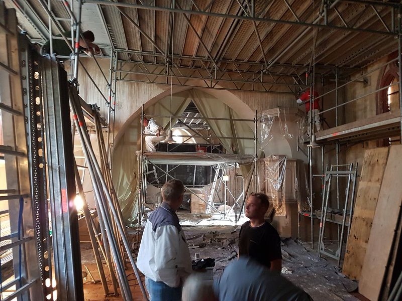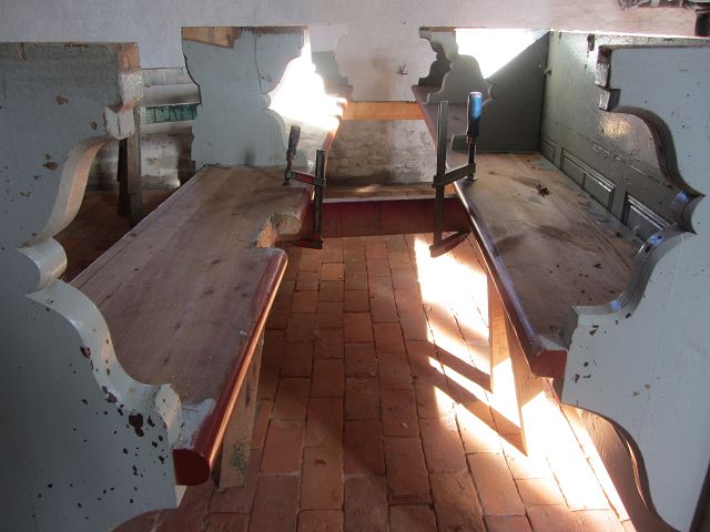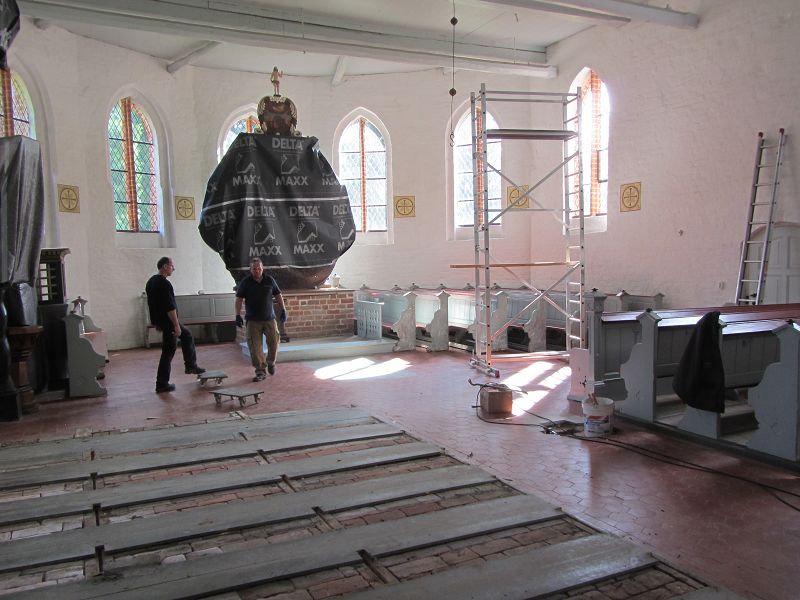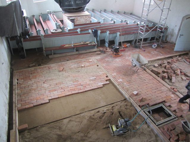 Es geht auf die Zielgerade! Der neue "halbe" Kirchen-Fussboden (unter dem Gestühl und im Mittelgang) ist nahezu fertig, die Tischler haben vor wenigen Tagen mit die Aufarbeitung der Kirchenbänke begonnen und so wird der ambitionierte Zeitplan, bis Ende Oktober fertig sein zu wollen, gehalten werden können !