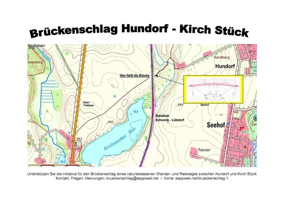 Seehof und Klein Trebbow wollen den Wanderweg von Hundorf nach Kirch Stück, den alten Kirchsteig, wieder beleben. Dazu ist eine Brücke über die Bahn notwendig und ...sie soll kommen. Dafür haben sich jetzt die Gemeindevertreter ausgesprochen. Für den "Brückenschlag" hat sich auch der Förderverein der Kirche zu Kirch Stück stark gemacht. mehr...