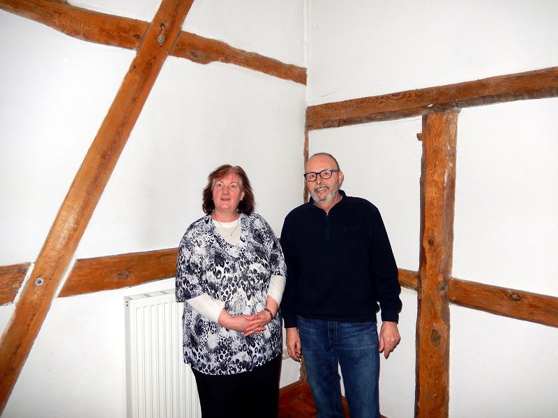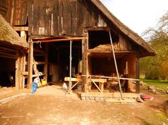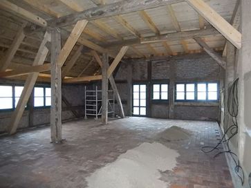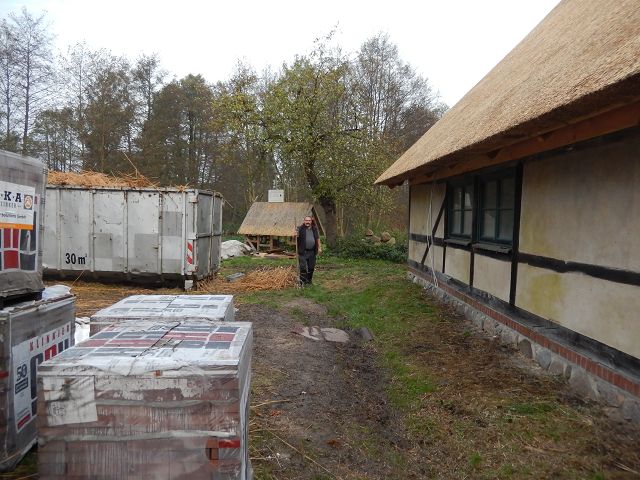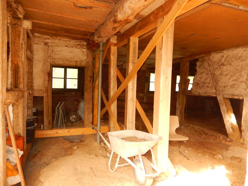 Gestern war Baubeginn! Im Moment werden die Steine aus dem schadhaften Fachwerk entfernt und die Böden auf ein gewisses Level gebracht. Dann geht es an die Holzarbeiten: schadhafte Balken werden entfernt und ersetzt. Dann erst kommt der Dachdecker zum Einsatz.