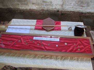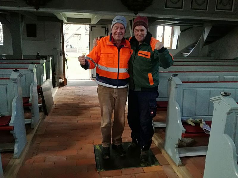 Stefan Sieler und Rainer Kloth hatten im Oktober die Bauarbeiten zur Schalung und für das Fundament in Eigenregie übernommen und stehen erstmalig stolz auf dem gelaserten „Gläserner Blick ins 18. Jahrhundert“, dem tiefer liegenden historischen Steinfußboden. Nach der Akklimatisierung wird im neuen Jahr die endgültige Verlegung erfolgen. Damit sind die umfangreichen Bauarbeiten des Jahres 2017 abgeschlossen und können zu den Christvespern und Festgottesdiensten bestaunt werden.