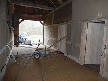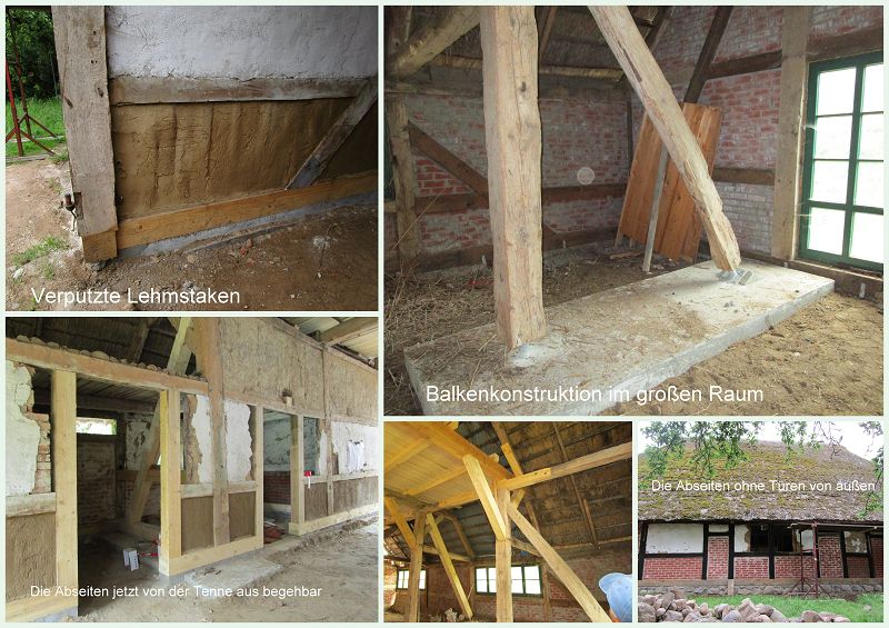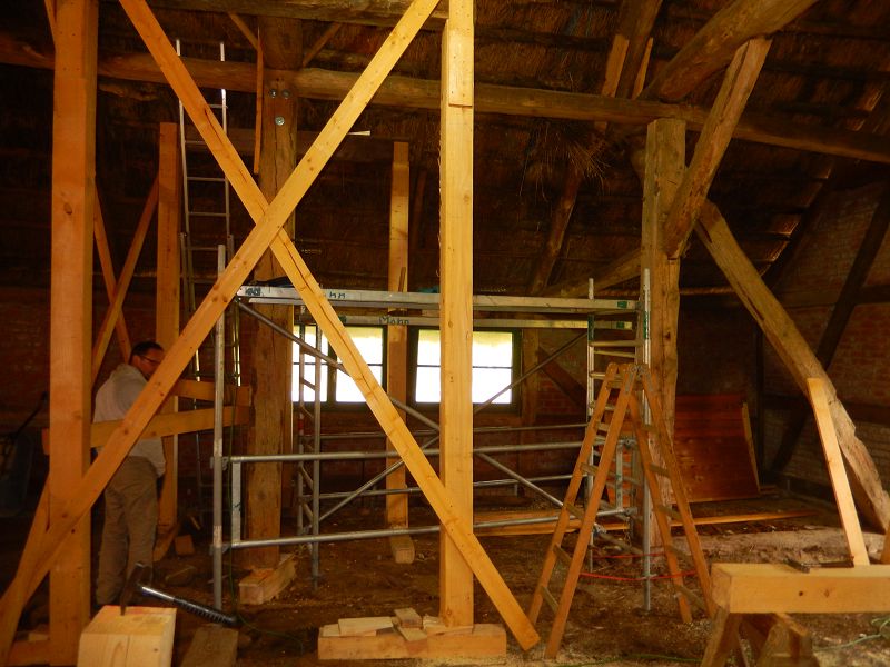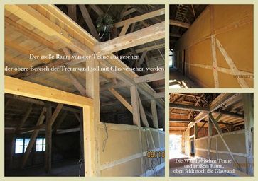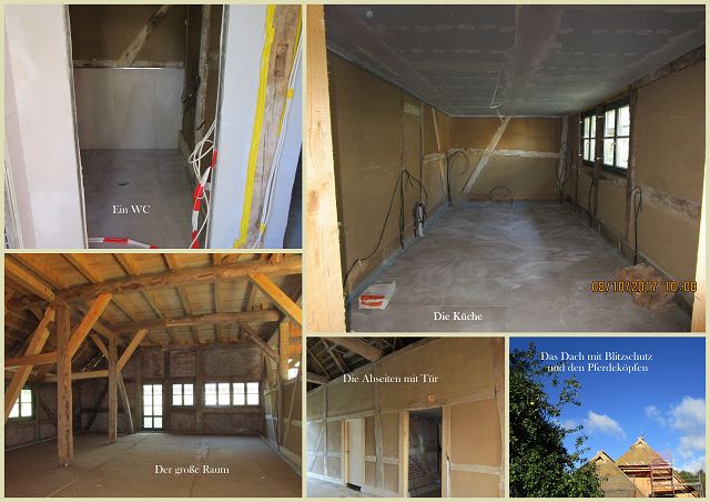 Es ist schön, wenn das Gerüst die Sicht nicht mehr stört. Blickfang: Das Dach und der Giebel. Auch im Innenbereich geht es gut voran. Wie lange noch? Wir erreichen die finanzielle Grenze. Die Scheune wird ca 60.000 € teurer als geplant. Gründe: Die drastisch gestiegenen Handwerkerpreise durch die gute Konjunktur am Bau und viele zuvor nicht erkennbare aber dringend notwendige Sanierungsarbeiten.
