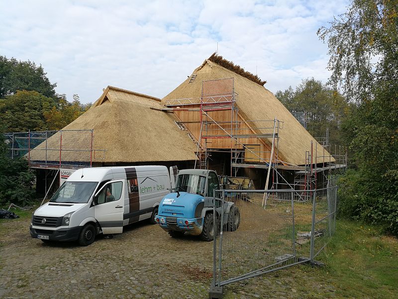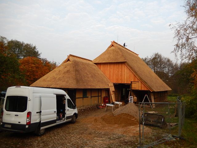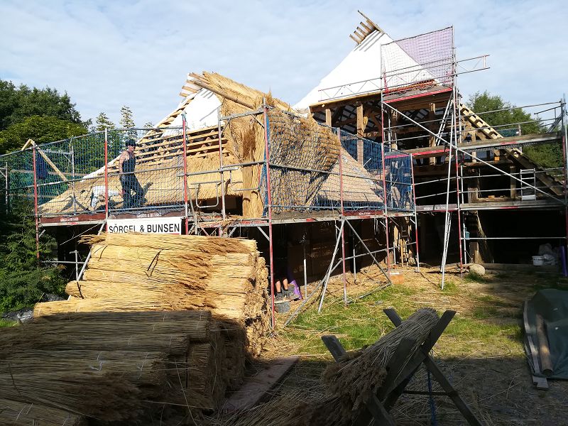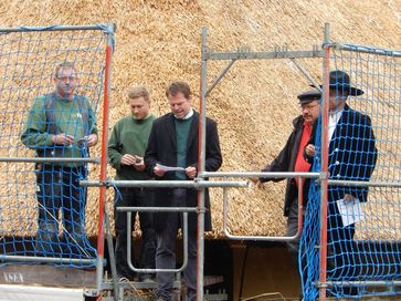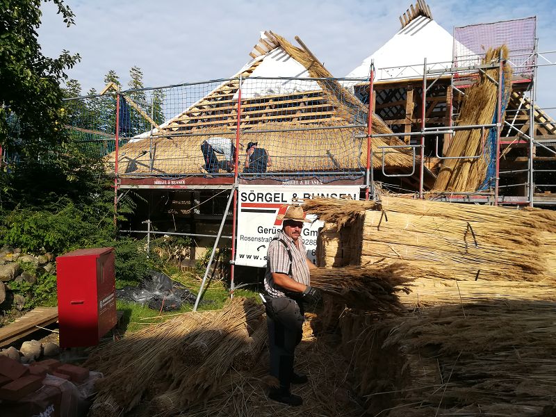 Die Reetdach-Experten um Meister Thorsten Ring (Das "Ring"- Dach) sind dabei, unserer Scheune den "Hut" aufzusetzen. Die Firma versteht sich zwar auf alle Dächer, aber der Naturstoff "Schilf" ist ihr besonders ans Herz gewachsen. Thorsten Ring und seine Gesellen haben alle Hände voll zu tun, wollen sie doch trotz der vielen Regentage und unvorhersehbarer Arbeiten am Dachstuhl versuchen, im Zeitplan zu bleiben.