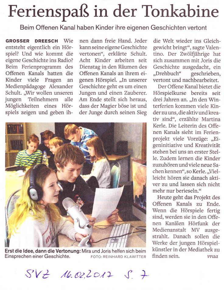17. Februar 2017Zeitung berichtet über Klientel für die Hörspielscheune zu Cramon