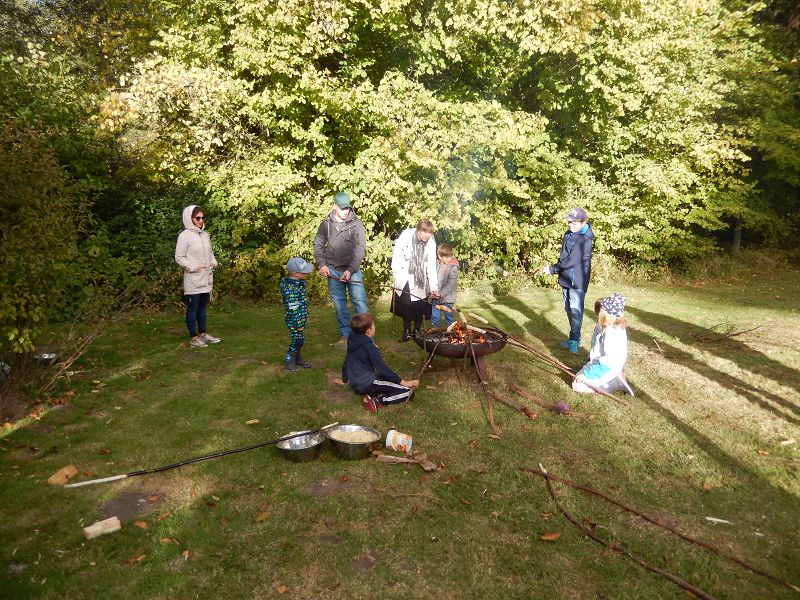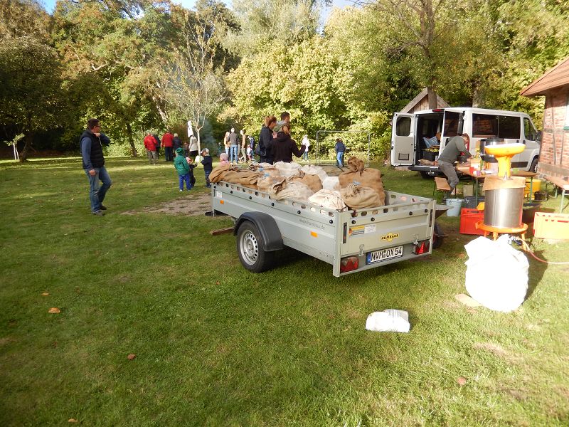 Gemeindepädagoge Konstantin Manthey hatte viele kleine und große Helfer. Gemeinsam wurden die Äpfel aufgesammelt und in Säcke verstaut. Einige wurden sofort zu Apfelsaft, Apfelgelee und Apfelkuchen verarbeitet. Frisch schmeckt's am Besten. Die Früchte in den Säcken voll werden demnächst noch in einer Standpresse zu Saft verarbeitet. Die schafft größere Mengen. Trotzdem war es interessant zu sehen, wie Apfelsaft entsteht und wie er haltbar gemacht und abgefüllt wird.