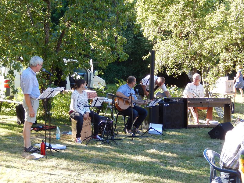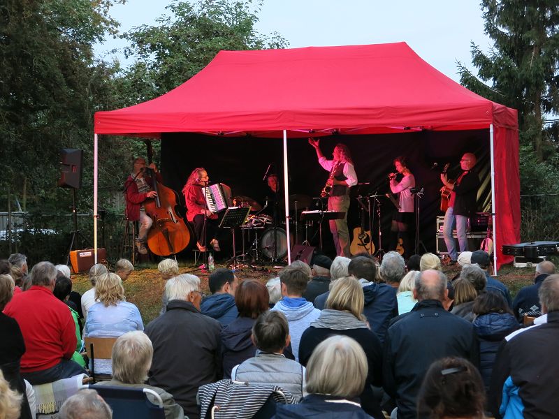 Über 120 Besucher haben am Freitag Abend auf dem Friedhofspark Kirch Stück einen schönen Sommerabend bei schwungvoller Musik erlebt. "Hilde's Dorforchester", die selbsternannte "Gesellschaft zur praktischen Verwendung organisierter Schallereignisse", war Gast des Fördervereins der Kirche zu Kirch Stück. Musik aus allen Kontinenten brachte nicht nur die Füße zum taktvollen Wippen, auch das Tanzbein wurde geschwungen. Ein begeistertes Publikum wurde fröhlich auf das Wochenende eingestimmt und zog bei einbrechender Dunkelheit zufrieden gestimmt nach Hause.