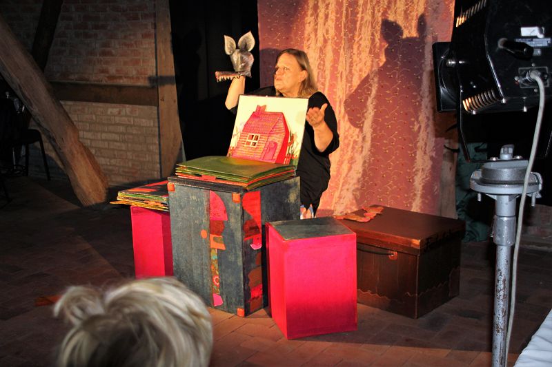 Mehr als 30 Kinder fieberten gemeinsam mit ihren Eltern und Großeltern mit, als Puppenspielerin Margrit Wischnewski in der Cramoner Hörspiel-und Begegnungsscheune die abenteuerliche Geschichte von den drei Ferkelchen und dem Wolf vorspielte. Die Pop-Up-Buch-Geschichte nach Motiven eines englischen Volksmärchens "Die drei kleinen Ferkelchen und der Wolf" beinhaltet lustige und lehrreiche Geschichten über die kleinen Schweinchen Tüpfelchen, Streifchen und Doppelchen, die in die große weite Welt ihr ziehen und ihr Glück suchen. Mit großen Augen verfolgten die Kinder die spannenden Abläufe und ließen sich von der Puppenspielerin in die wunderbare Welt der Fantasie mitreißen. Margrit Wischnewski punktete mit Stimme und Mimik und ihrer natürlichen Art. Die schöne Kulisse und die bunten Requisiten, fast alles aus Pappe, wurden von ihr selbst angefertigt. Sie ist Initiatorin des Schweriner Puppentheater im E-Werk und arbeitete bis 2010 als Regisseurin, Ausstatterin und Puppenspielerin am Mecklenburgischen Staatstheater in Schwerin.