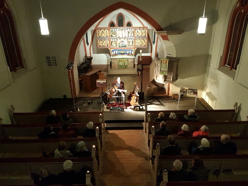 35 Besucher erlebten ein wundervolles Konzert mit Ingo Barz. "An einem Tag wie diesem" war das Motto seines neuen Konzertes und "kluge Leute konnten kluge Verse" hören. Auf verschiedensten Gitarren und auch einer Harfenzither begleitete er seinen einfühlsamen Gesang. Seine Texte, seien es nun die Liedtexte oder seine Moderation, waren sehr hinhörenswert und regten zum Nachdenken an. Ein zufriedenes Publikum nutzte nach Konzertende noch die Möglichkeit zu eingehenden Gesprächen sowohl mit Ingo Barz als auch mit den Mitgliedern des Vorstandes des Fördervereins der Kirche zu Kirch Stück e.V.