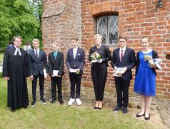 Im Festgottesdienst in der Kirche zu Groß Trebbow haben sich sechs junge Leute zu Gott bekannt. Ein Jugendlicher wurde getauft und alle haben nach dem Glaubensbekenntnis den Segen zugesprochen bekommen. Eingesegnet wurden (v.r.n.l.): Henrike Glißmann, David Ganssauge, Annabell Kose, Bjarke Sommer, Tilian Dagge und Thorge Triebe.