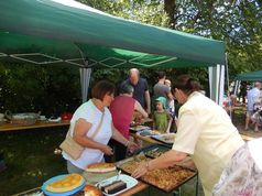 Wie schon so oft hatte unsere Kirchengemeinde Besuch von Schweriner Kirchengemeinden (Versöhnungs-, Petrus-und Bernogemeinde) , die es per Fahrrad oder auch Automobil (ein paar wenige) den Weg ins Grüne, in den herrlichen Cramoner Pfarrgarten zog. Nach einem Gottesdienst unter freiem Himmel und feinstem Sonnenschein, den unser Bläserchor sehr klangvoll ausschmückte, gab's Kaffee und Kuchen, eine Grillwurst und allerlei zu trinken. Viele der Gäste staunten über unsere rekonstruierte "Hörpielscheune", die wir zu Johanni in Betrieb nehmen wollen. Einstimmige Meinung: Ein sehr gelungenes christliches Fest! Zufriedene, fröhliche Gäste - das beste Dankeschön!